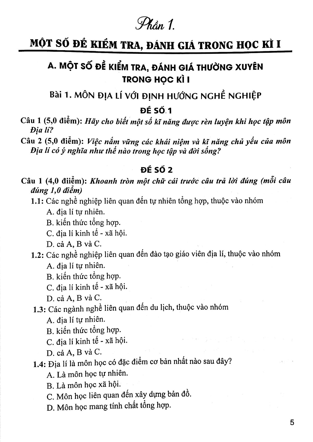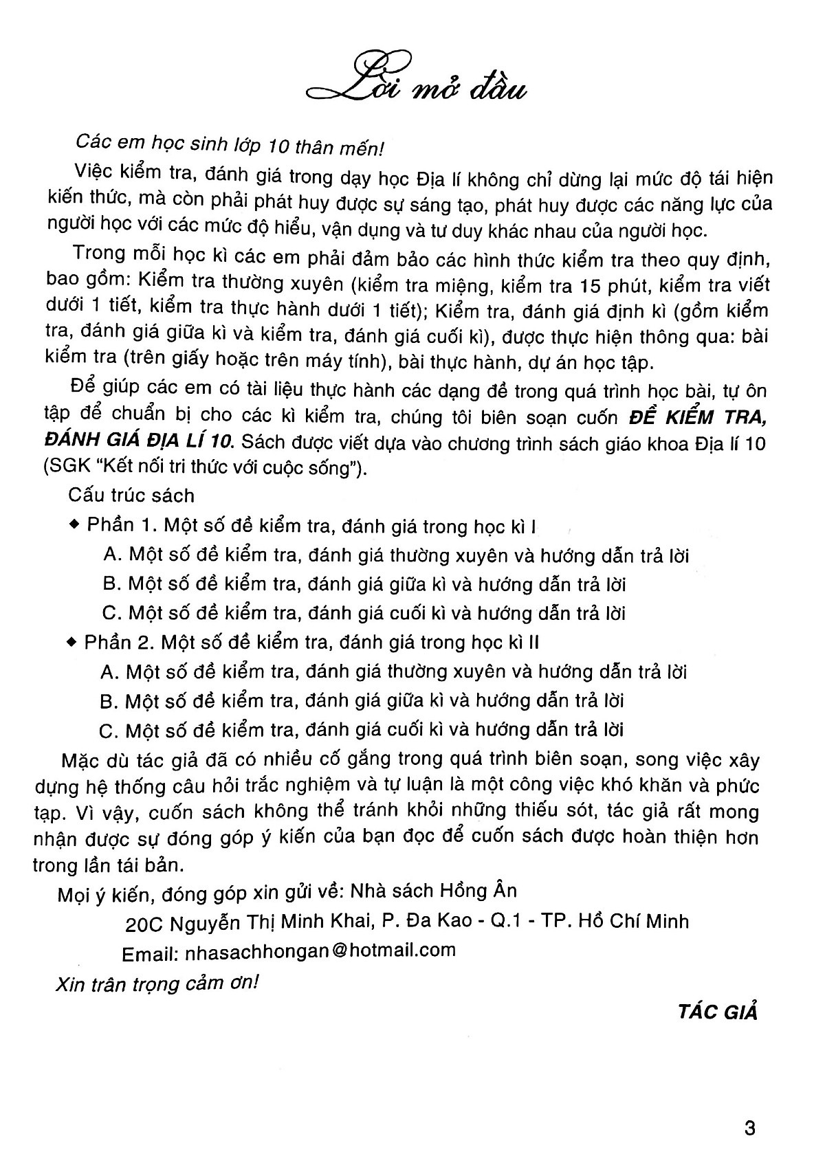 Để giúp các em có tài liệu thực hành các dạng đề trong quá trình học bài, tự ôn tập để chuẩn bị cho các kì kiểm tra, chúng tôi biên soạn cuốn ĐỀ KIỂM TRA, ĐÁNH GIÁ ĐỊA LÍ 10. Sách được viết dựa vào chương trình sách giáo khoa Địa lí 10 (SGK “Kết nối tri thức với cuộc sống”).