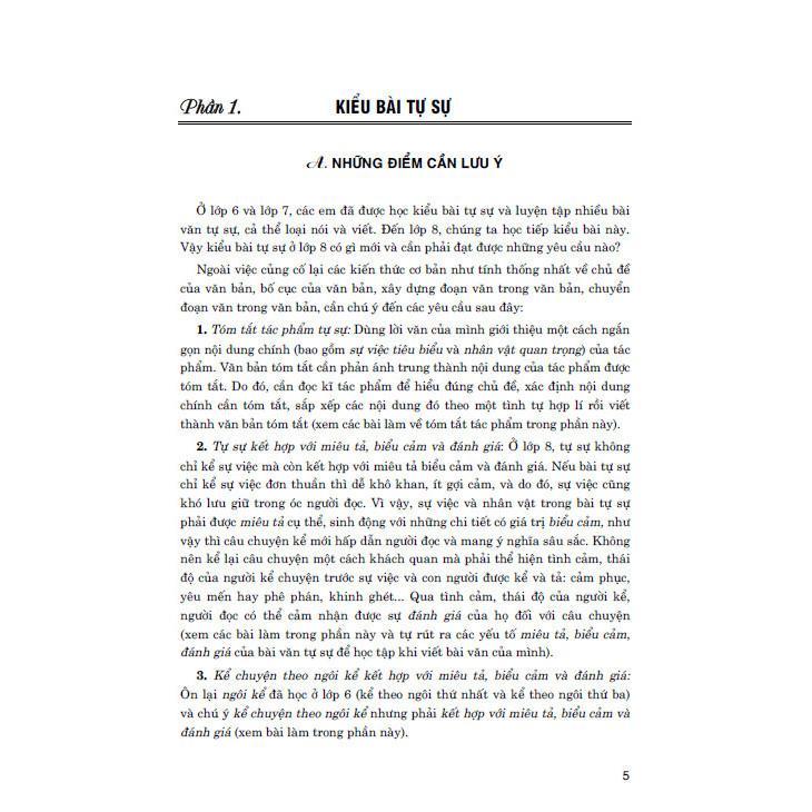 Nội dung cuốn sách gồm 5 kiểu bài làm văn ở lớp 8: tự sự, thuyết minh, nghị luận, tường trình, thông báo. Thuyết minh, tường trình, thông báo là những kiểu bài mới; tự sự, nghị luận tuy đã học ở lớp 6 và lớp 7, nhưng đến lớp 8, hai kiểu bài này có những yêu cầu mới cao hơn, và những yêu cầu này sẽ được thể hiện trong các bài làm văn của cuốn sách. Mỗi kiểu bài sẽ được trình bày theo ba phần: