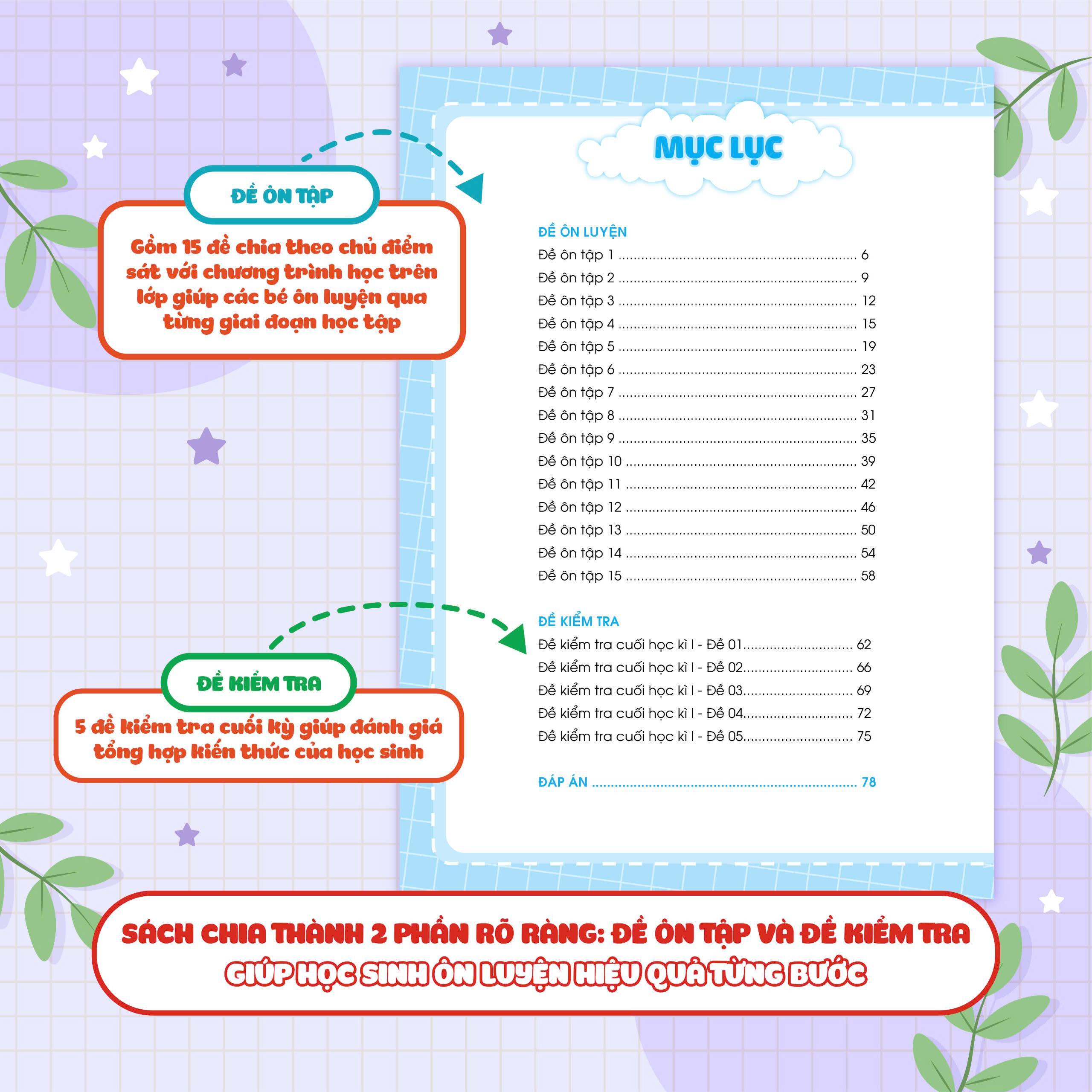 - Sách được chia thành 2 phần rất dễ hiểu cho các bé: Phần đề ôn tập và Phần đề kiểm tra. Phần đề ôn tập: Gồm 15 đề được chia theo các chủ điểm, hoặc chia thành các đề ôn tập theo sát chương trình học trên lớp theo giai đoạn. Phần đề kiểm tra: Gồm 5 đề kiểm tra cuối học kỳ để kiểm tra, đánh giá kiến thức tổng hợp của học sinh.