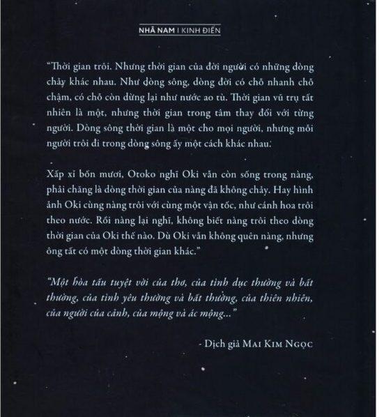 Xấp xỉ bốn mươi, Otoko nghĩ Oki vẫn còn sống trong nàng, phải chăng là dòng thời gian của nàng đã không chảy. Hay hình ảnh Oki cùng nàng trôi với cùng một vận tốc, như cánh hoa trôi theo nước. Rồi nàng lại nghĩ, không biết nàng trôi theo dòng thời gian của Oki thế nào. Dù Oki vẫn không quên nàng, nhưng ông tất có một dòng thời gian khác.”