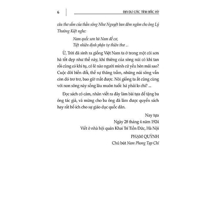 Ta thường xưng con tiên cháu rồng, nhưng mấy ai thuộc lịch sử của ông cha? Bởi vì sách phổ thông quốc sử hãy còn hiếm. Lại thường phô non sông gấm vóc, nhưng mấy ai biết hình thể của nước nhà? Bởi vì sách phổ thông địa dư hãy còn ít.