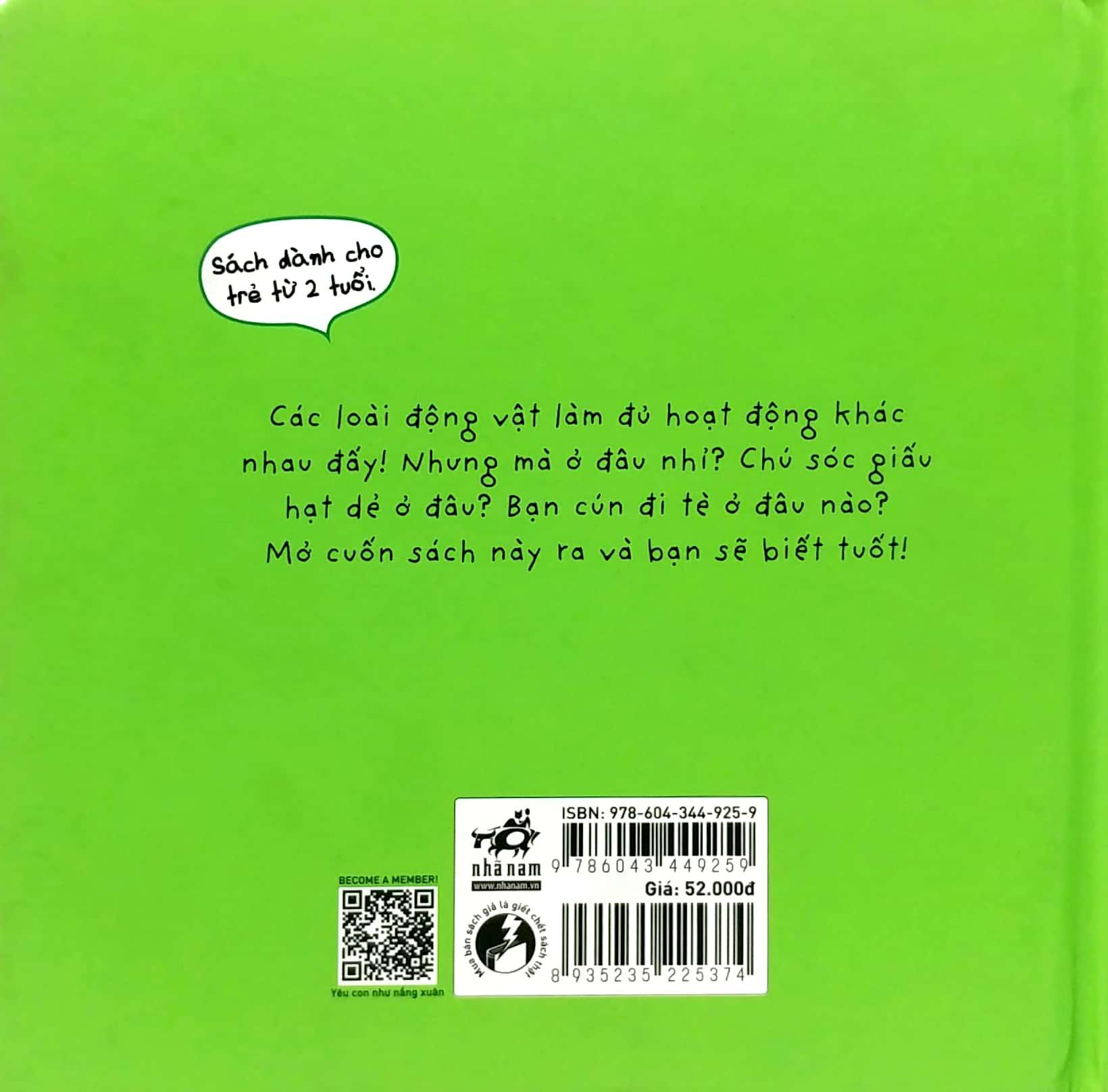 Các loài động vật làm đủ hoạt động khác nhau đấy! Nhưng mà ở đâu nhỉ? Chú sóc giấu hạt dẻ ở đâu? Bạn cún đi tè ở đâu nào? Mở cuốn sách này ra và bạn sẽ biết tuốt!