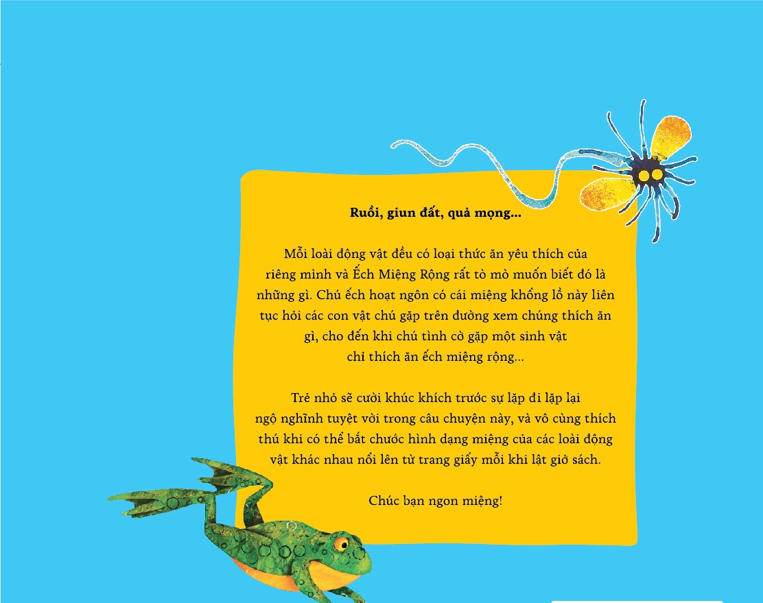 Trẻ nhỏ sẽ cười khúc khích trước sự lặp đi lặp lại ngộ nghĩnh tuyệt vời trong câu chuyện này, và vô cùng thích thú khi có thể bắt chước hình dạng miệng của các loài động vật khác nhau nổi lên từ trang giấy mỗi khi lật giở sách.
