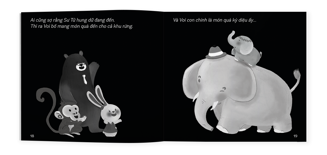 Voi con đến rồi: Gia đình Voi hạnh phúc đón đứa con đầu lòng và muốn chia sẻ niềm vui ấy đến tất cả mọi người trong khu rừng. Voi bố bèn dẫn theo Voi con đến gõ cửa từng nhà. Nhưng tất cả mọi người đều lo lắng người đứng bên ngoài cửa là Sư Tử. Voi bố bèn giải thích hai bố con không phải là Sư Tử. Vì thế mà được mọi người đón tiếp và nhận những lời chúc tốt đẹp. Thế nhưng vào lúc tất cả đang ăn mừng thì Sư Tử xuất hiện. Sư Tử không đến để ăn thịt ai. Nó mang theo bó mía tặng Voi con và gửi lời chúc mừng đến gia đình Voi.