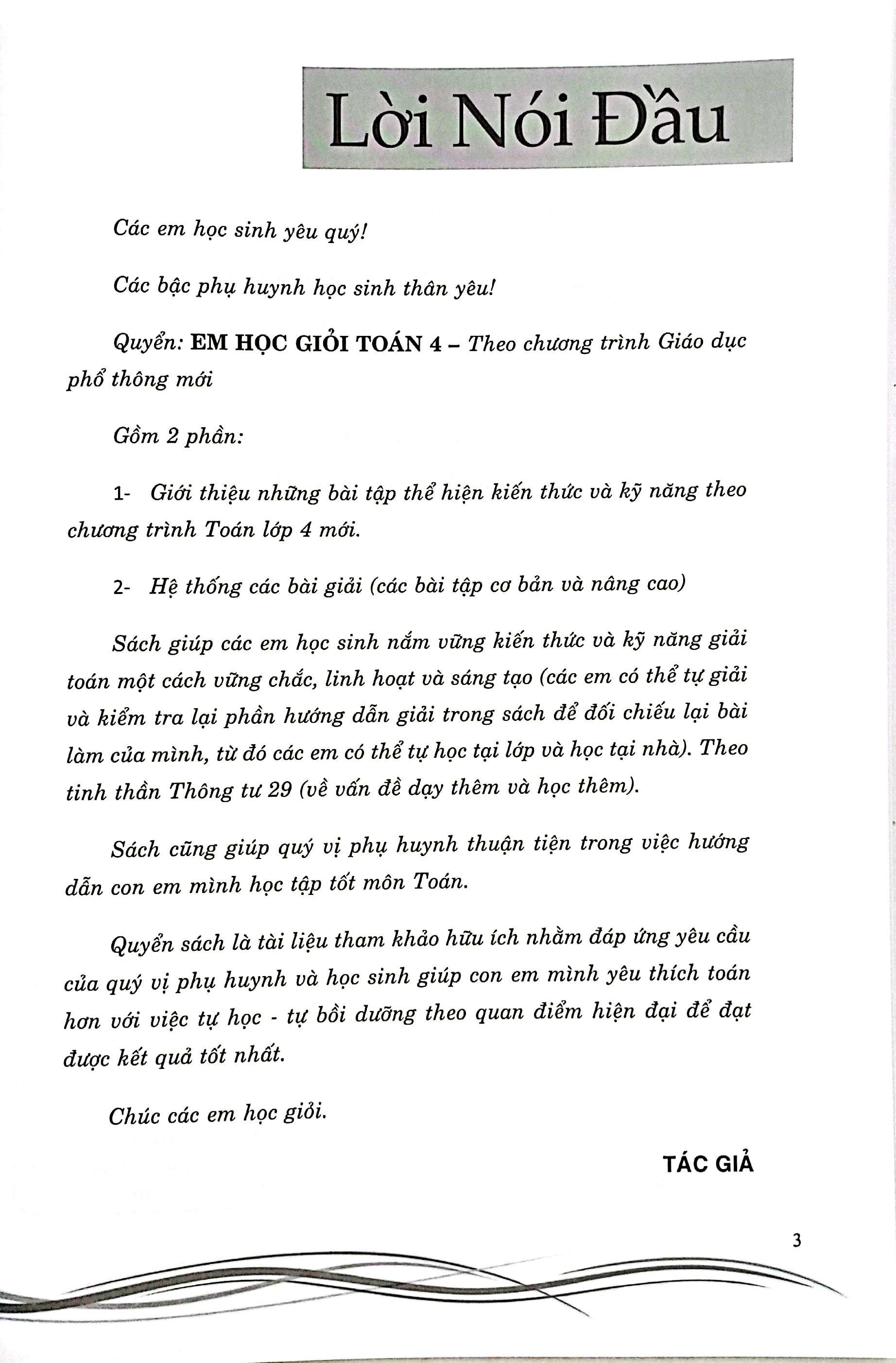 Em Học Giỏi Toán 4 ( Dùng Chung Các Bộ SGK ) Cuốn sách này là của các em, nó sẽ là người bạn đi cùng với các em trong cả năm học. Các em nên biết cách sử dụng cuốn sách để đạt hiệu quả cao nhất. Đọc Tiêu đề của tiết học, em hãy nghĩ xem m.ình đã biết gì về chủ đề này và thư hình dung những gì sẽ được học trong bài. Mục Đi đến kiến thức giúp các em làm quen với nội dung sắp học, tạo tình huống để các em hứng thú với bài học mới. Có thể có những câu hỏi ở mục này mà các em chưa trả lời được, nhưng không sao, các em sẽ hiểu sau khi học bài mới. Mục Hình thành và áp dụng kiến thức rất quan trọng, giúp các em có thêm những kiến thức, kĩ năng và phương pháp mới. Các em cần hiểu kĩ những nội dung được đóng khung, vì đó là những kiến thức quan trọng nhất, và tự làm các câu hỏi áp dụng trong mục này. Mục Tự ôn lí thuyết giúp các em tự kiểm tra việc tiếp thu những kiến thức quan trọng nhất của bài học, từ đó có chìa khoá để giải bài tập. Mục Luyện tập dành cho các em tự làm để củng cố và hoàn thiện các kiến thức, kĩ năng vừa tiếp nhận. Các bài tập được đánh số liên tục ở mỗi chương. Các em cần làm hết các bài tập này vì chúng là những bài tập cơ bản nhất. Mục Sổ tay kinh nghiệm là những kinh nghiệm về cách giải toán, các em có thể bổ sung vào đó những kinh nghiệm của chính m.ình, nếu có. Mục Vận dụng – Đào sâu gồm hai nội dung. Nội dung Vận dụng giúp các em áp dụng những điều đã học vào các tình huống trong cuộc sống. Nội dung Đào sâu không yêu cầu tất cả các em phải thực hiện. Các em đọc để hiểu thêm, và nếu thấy đủ sức thì tiếp tục làm. Mục Tìm tòi khám phá giúp các em tìm tòi và phát hiện những điều mới mẻ. Cũng không yêu cầu tất cả các em phải thực hiện đủ các nội dung này. Cuối sách có phần Hoạt động thực hành và trải nghiệm gồm những nội dung thực hành, đo đạc và những trò chơi giúp các em vui học. Em hãy cùng học cùng chơi với các bạn theo từng cặp, theo từng nhóm và trong cộng đồng. Các bài tập trong sách thường không khó, nhưng đều có tình huống, giúp các em nắm vững kiến thức, rèn luyện kĩ năng, trau dồi phương pháp. Các em nên tự suy nghĩ và giải chúng. Các bài tập này sẽ giúp các em nhiều điều, và chúng vẫn còn có ích ngay cả khi các em đã rời trường. Tất cả các kiến thức của môn Toán, cũng như của các môn học khác, đều sẽ rất cần thiết cho các em, nếu các em muốn trở thành người làm chủ cuộc sống của m.ình. Trong các bài tập còn có những Bài toán trong đoạn văn, ở đó có thêm nhiều thông tin bổ sung cho đề bài, đôi khi có cả những con số không dùng đến, nhằm giúp các em biết chọn lọc những nội dung và số liệu cần thiết để tìm lời giải. Cuốn sách được viết theo hướng Dễ hiểu - Đầy đủ – Sinh động - Tự học – Thực tế. Các em hãy giữ gìn cuốn sách, không viết vào sách nếu muốn cho em của m.ình hay cho bạn khác sử dụng. Cũng có thể em sẽ giữ lại cuốn sách này cho m.ình để dùng trong những năm sau. Cuốn sách sẽ đồng hành với các em trong một thời gian dài. Đi kèm với cuốn sách này có cuốn Bài tập Em học Toán 6 - Tập một để giúp các em luyện tập thêm. Tác giả mong rằng: Em Học Giỏi Toán 4 rất nhiều điều hay chờ em khám phá trong cuốn sách này.