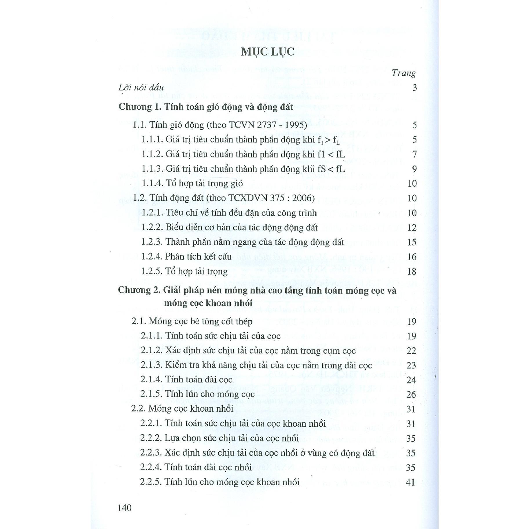 Để phục vụ việc tính toán nhà cao tầng, trong cuốn sách tác giả còn trình bày cách tính gió động và động đất theo tiêu chuẩn động đất mới nhất của Việt Nam : TCXDVN 375 : 20, đồng thời đưa ra phương pháp tính toán nền móng nhà cao tầng bằng giải pháp móng cọc đóng(ép) và móng cọc khoan nhồi.