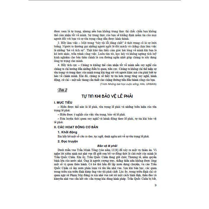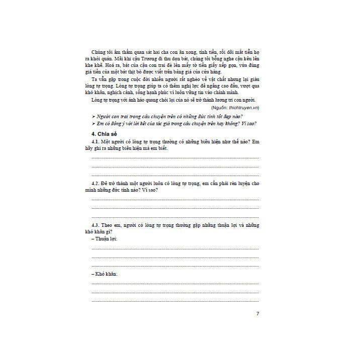 Ở từng bài, các em có thể thực hiện hoạt động theo thứ tự hoặc theo từng phần: đọc câu chuyện, xử lí các tình huống, chia sẻ, nhận diện và hành động,... liên quan đến hành vi, thói quen đạo đức, kĩ năng sống của bốn chủ đề nêu trên. Có những hoạt động các em sẽ thực hiện được ngay nhưng cũng có những hoạt động nếu các em chưa giải quyết được thì đừng nản chí mà hãy kiên nhẫn, bình tĩnh suy nghĩ, nhất định sẽ khám phá và làm chủ được vấn đề.