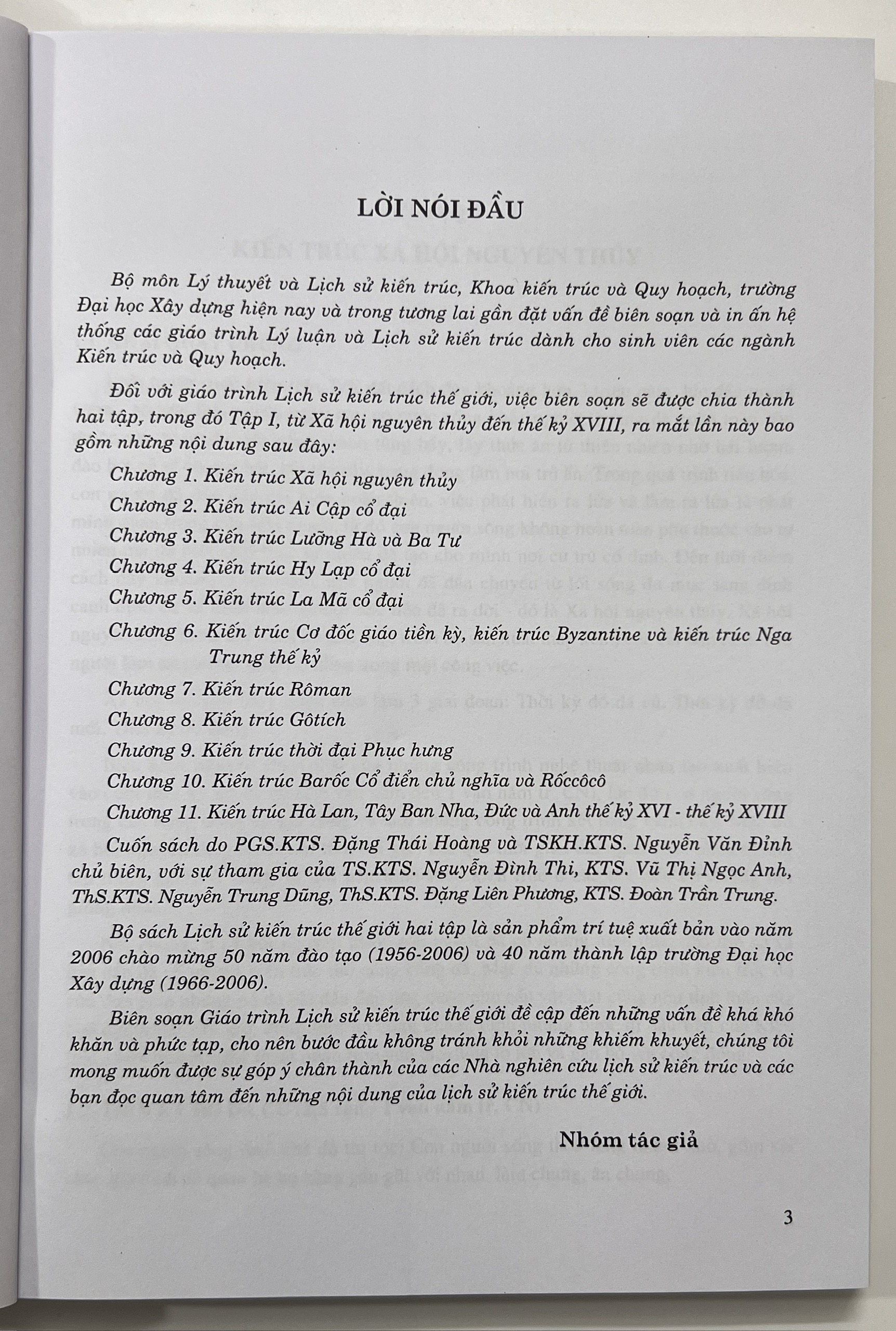 Đối với giáo trình Lịch sử kiến trúc thế giới, việc biên soạn sẽ được chia thành hai tập, trong đó Tập I, từ Xã hội nguyên thủy đến thế kỷ XVIII, ra mắt lần này bao gồm những nội dung sau đây: