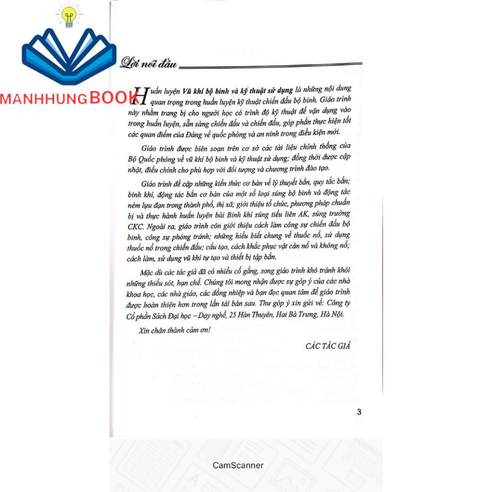 Nội dung: "Huấn luyện Vũ khí bộ binh và kỹ thuật sử dụng là những nội dung H quan trọng trong huấn luyện kỹ thuật chiến đấu bộ binh. Giáo trình này nhằm trang bị cho người học có trình độ kỹ thuật để vận dụng vào trong huấn luyện, sẵn sàng chiến đấu và chiến đấu, góp phần thực hiện tốt các quan điểm của Đảng về quốc phòng và an ninh trong điều kiện mới.