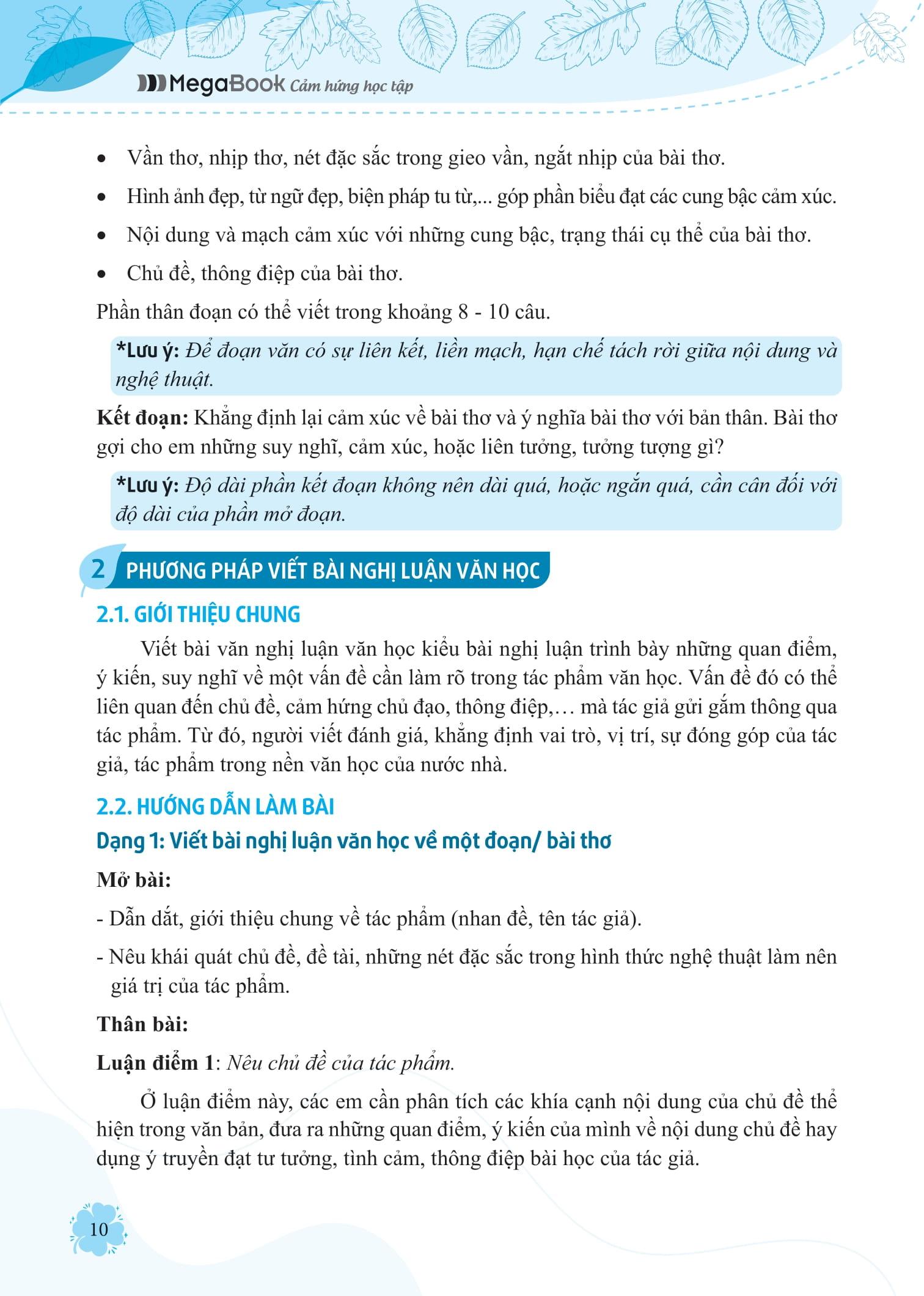 - Phương pháp viết đoạn và bài văn theo các dạng bài trong SGK: đưa ra những hướng dẫn tỉ mỉ, cụ thể cách viết đoạn văn ghi lại cảm xúc về một bài thơ 8 chữ và viết bài văn theo từng thể loại cụ thể (nghị luận xã hội, nghị luận văn học, thuyết minh, kịch).