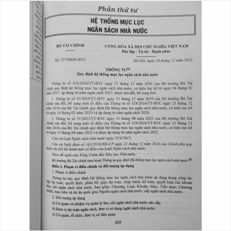 Ngày 26-12-2022 Bộ Tài chính ban hành Văn bản hợp nhất số 27/VBHN-BTC hợp nhất Thông tư Quy định Hệ thống mục lục ngân sách nhà nước. Văn bản này hợp nhất các Thông tư 51/2022/TT-BTC, Thông tư số 93/2019/TT-BTC, Thông tư 324/2016/TT-BTC ngày 21-12-2016 của Bộ Tài chính. Theo đó, Văn bản hợp nhất này quy định Hệ thống mục lục ngân sách nhà nước áp dụng trong công tác lập dự toán; quyết định, phân bổ, giao dự toán; chấp hành, kế toán, quyết toán các khoản thu, chi ngân sách nhà nước, bao gồm: Chương; Loại, Khoản; Mục, Tiểu mục; Chương trình, mục tiêu và dự án quốc gia; Nguồn ngân sách nhà nước; cấp ngân sách nhà nước. Đối tượng áp dụng: cơ quan có nhiệm vụ quản lý thu, chi ngân sách nhà nước các cấp; đơn vị dự toán ngân sách, đơn vị sử dụng ngân sách nhà nước; cơ quan, tổ chức, đơn vị có liên quan.