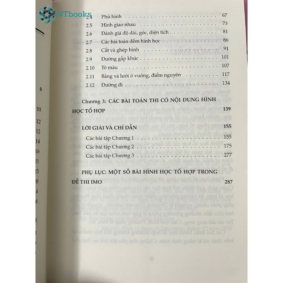 Hình học tổ hợp cũng rất phong phú về phương pháp giải. Cuốn sách giỏi thiệu vói bạn đọc các phương pháp giải toán Hình học tổ hợp, từ những phương pháp quen thuộc nhất như Phương pháp phản chứng, nguyên lý Dirichlet, Quy nạp toán học, nguyên lý cực hạn cho đến những phương pháp ít gặp hơn như Tạo đa giác bao, Tạo các dải song song, Chia nhỏ hình, Phương pháp tô màu,