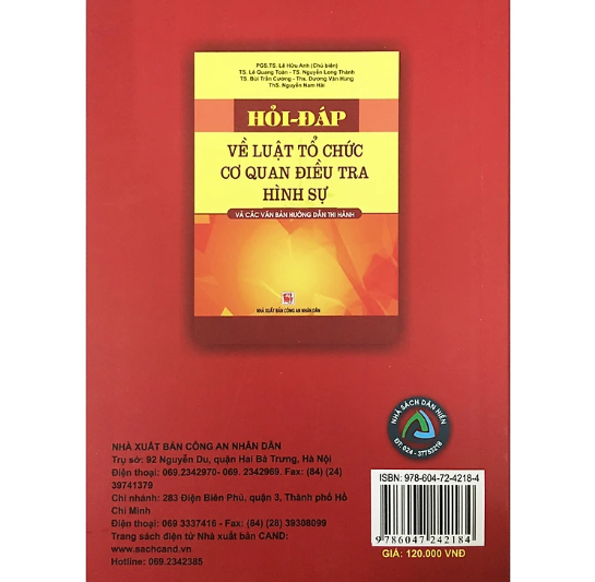 Hỏi - đáp luật tố tụng hình sự năm 2015 Tác giả: TS Phạm Thị Thoa - Học viện cảnh sát nhân dân (Chủ biên) NXB công an nhân dân Khổ 14,5 x 20,5 cm,