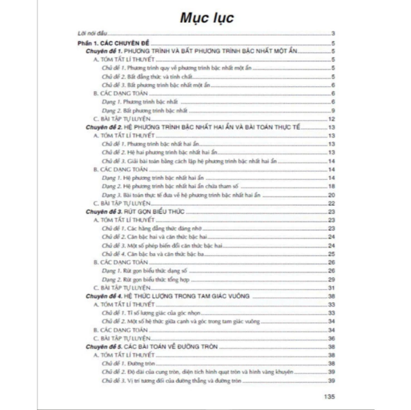 1. Nội dung sách tổng ôn toán học lớp 9 Tập 1 gồm 4 chương: - Chương 1: Căn bậc hai, căn bậc ba. - Chương 2: Hàm số bậc nhất. - Chương 3: Hệ