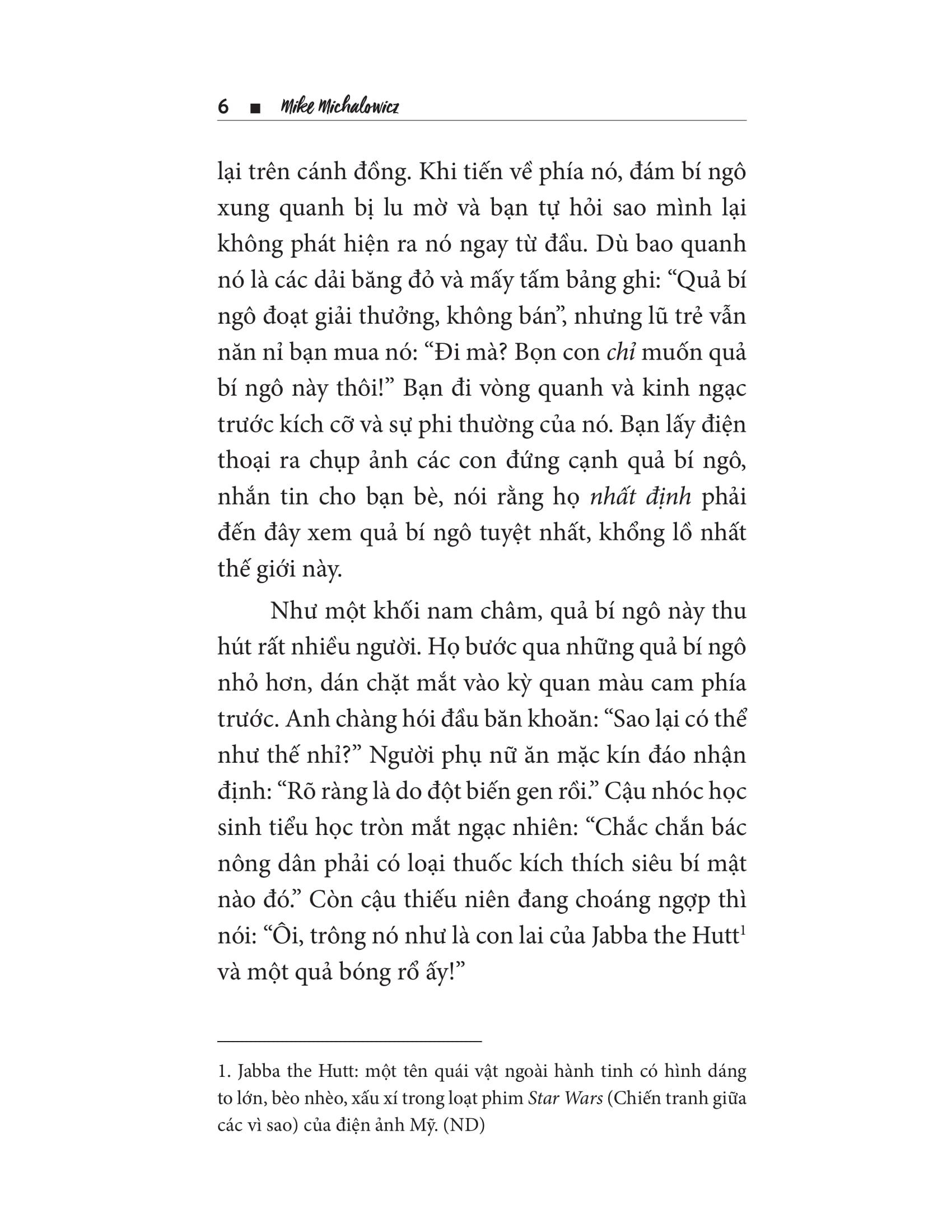 - Các sinh viên chuẩn bị bước vào thị trường lao động, những nhân viên, bất cứ ai mong muốn đóng góp điều gì đó có ý nghĩa cho thế giới này. THÔNG TIN TÁC GIẢ Mike Michalowicz Trước tuổi 35, ông đã thành lập và bán thành công hai công ty trị giá hàng triệu đô-la. Ông sáng lập Profit First, một công cụ được hàng trăm nghìn công ty trên toàn cầu sử dụng để thúc đẩy lợi nhuận. Ông là tác giả của nhiều đầu sách như: Fix This Next, Surge, The Pumpkin Plan, Profit First và The Toilet Paper Entrepreneur. Ông từng là chuyên gia bình luận về doanh nghiệp nhỏ cho tờ The Wall Street Journal và dẫn chương trình giải cứu doanh nghiệp trên MSNBC. Mike là diễn giả chính nổi tiếng trên các diễn đàn về chủ đề khởi nghiệp sáng tạo, đồng thời còn là diễn giả khách mời cho các chương trình khởi nghiệp tại các trường đại học như Columbia, Copenhagen Business School, Emerson, Harvard, Penn State, Pepperdine và Princeton. ĐÁNH GIÁ/ NHẬN XÉT CỦA BÁO CHÍ/CHUYÊN GIA “Mỗi trang, mỗi chương, khi đọc cuốn sách này, tôi đều tự hỏi, sao m.ình lại không nghĩ ra nhỉ? Thật đáng kinh ngạc! Quả là một cuốn sách tuyệt vời. Một quả bí ngô! Ai mà ngờ được chứ? Tất cả các doanh nhân, chủ doanh nghiệp, hãy đọc nó đi! Hãy làm ngay đi!” —Michael Gerber, tác giả của The E-Myth và là người sáng tạo ra The E-Myth Evolution “Một cuốn sách tuyệt vời khác của Mike Michalowicz! Sự hài hước ngẫu hứng và hiểu biết sâu sắc về kinh doanh của Mike đảm bảo rằng Kế hoạch bí ngô là một cuốn sách mà các doanh nhân nên đọc trong nhiều năm tới.”—Guy Kawasaki, tác giả của Enchantment và The Art of the Start “Những lời khuyên sâu sắc, thẳng thắn hướng đến những doanh nhân đang mắc kẹt giữa sự chung chung thay vì cụ thể, có ý nghĩa. Rất nhiều hạt giống đáng để gieo trồng.”—Seth Godin, tác giả của Con bò tía “Michalowicz lại một lần nữa thành công rực rỡ. Kế hoạch bí ngô tràn ngập sự hài hước tuyệt vời của Mike và là một hướng dẫn từng bước phi thường dành cho những doanh nhân đang gặp khó khăn trong việc phát triển kinh doanh.”—J. J. Ramberg, người dẫn chương trình Your Business của MSNBC “Với phong cách ‘điên rồ như cáo’, Mike Michalowicz tiết lộ lý do tại sao việc bắt chước một người nông dân trồng bí ngô lại mang đến cho bạn thành công vượt trội. Michalowicz đang nhanh chóng trở thành một trong những tác giả kinh doanh sáng tạo nhất thời đại.”—Rieva Lesonsky, Giám đốc điều hành của GrowBiz Media, cựu biên tập viên tạp chí Entrepreneur “Mike giúp việc biến doanh nghiệp của bạn từ bình thường thành phi thường trở nên dễ dàng như làm theo một công thức đơn giản từng bước. Cuốn sách này hé lộ những kiến thức và sự thông thái mà tôi hiếm khi thấy trong các tác phẩm trước đây. Nếu bạn chỉ đọc một cuốn sách trong năm nay, hãy chọn Kế hoạch bí ngô.”—Bob Burg, đồng tác giả của The Go-Giver và Endless Referrals TRÍCH ĐOẠN “Kinh doanh không phải là một cuộc ganh đua về danh tiếng. Đừng bận tâm về việc phải có được nhiều khách hàng nhất. Hãy gây dựng một doanh nghiệp có thể đáp ứng nhu cầu của những khách hàng tốt nhất... phù hợp với bạn nhất. Bạn không cần phải được bầu chọn làm nữ hoàng của buổi dạ tiệc, mà chỉ cần một nhóm bạn thân thiết với tính cách tuyệt vời và tấm lòng kiên định, những người sẵn sàng làm mọi thứ vì bạn, cũng như bạn luôn sẵn sàng vì họ. Hãy luôn là chính m.ình và đừng bao giờ thỏa hiệp.” “Bạn cần nhớ một điều rằng, cũng như trong một vườn bí ngô, việc diệt trừ cỏ dại là một quá trình không ngừng nghỉ. Các công ty đều sẽ thay đổi và khách hàng cũng có kẻ đi người đến. Khi đã nắm được cách thực hiện, cứ mỗi quý, bạn hãy lập một Bảng đánh giá mới. Hãy dành riêng một hoặc hai ngày để đánh giá khách hàng và đưa ra những quyết định khó khăn mà giờ đây đã trở nên quen thuộc. Bạn sẽ chẳng bao giờ biết khi nào thì một cọng cỏ dại đáng ghét hay một quả bí ngô nhiễm bệnh sẽ lẻn vào thôn tính toàn bộ khu vườn của bạn đâu.” “Trong nhiều năm qua, tôi đã phát triển được Bộ ba câu hỏi, tuy đơn giản nhưng lại vô cùng hiệu quả. Nếu được hỏi theo đúng thứ tự, ba câu hỏi này sẽ giúp nhân viên suy nghĩ và đưa ra những quyết định luôn có lợi nhất cho công ty của bạn. Vì chúng rất hiệu quả, nên có lẽ bạn sẽ muốn in một bản các câu hỏi này ra và dán chúng lên bàn làm việc của từng nhân viên... Đây là Bộ ba câu hỏi, sắp xếp đúng thứ tự: