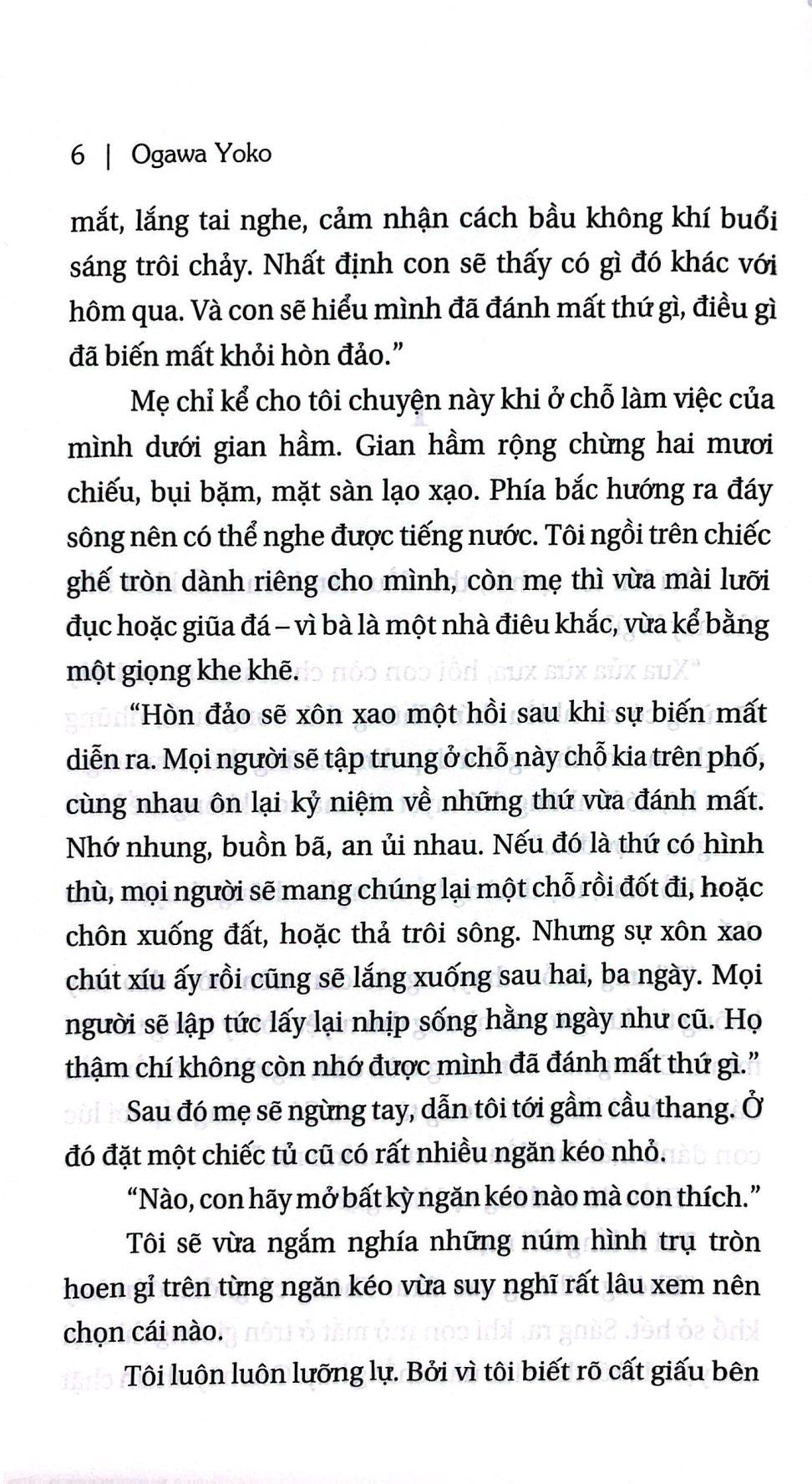 Trên một hòn đảo nọ mọi thứ cứ dần biến mất. Khi là cái ruy băng, khi là ảnh, khi là lịch, khi là cái chân trái... Và khi một thứ nào đó biến mất, người dân trên đảo sẽ mất hết khái niệm, ký ức về thứ ấy. Nhưng họ cũng không phản kháng, họ đem đốt, chôn, thả trôi sông... những thứ biến mất và chấp nhận sự biến mất như một lẽ thường. Cảnh sát ký ức luôn đảm bảo cho sự biến mất diễn ra mau lẹ và triệt để. Thế nhưng, có những người không bị ảnh hưởng bởi sự biến mất, họ không quên bất cứ thứ gì, và họ bị cảnh sát ký ức truy lùng. Trong hoàn cảnh nguy hiểm mà kỳ lạ ấy, rốt cuộc, số phận của hòn đảo nơi ký ức dần bị xóa nhòa trong lặng lẽ, chẳng khác nào quá trình kết tinh diễn ra âm thầm không ai hay biết này, sẽ đi về đâu?