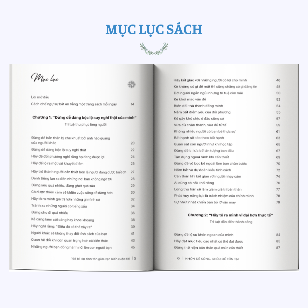 Cuốn sách gồm 198 bí kíp được chia nhỏ theo từng tình huống cụ thể trong cuộc sống, công việc và các mối quan hệ. Mỗi bí kíp chỉ gói gọn trong 1–2 trang, súc tích nhưng “đắt giá”, giúp bạn dễ tiếp cận và áp dụng ngay lập tức.