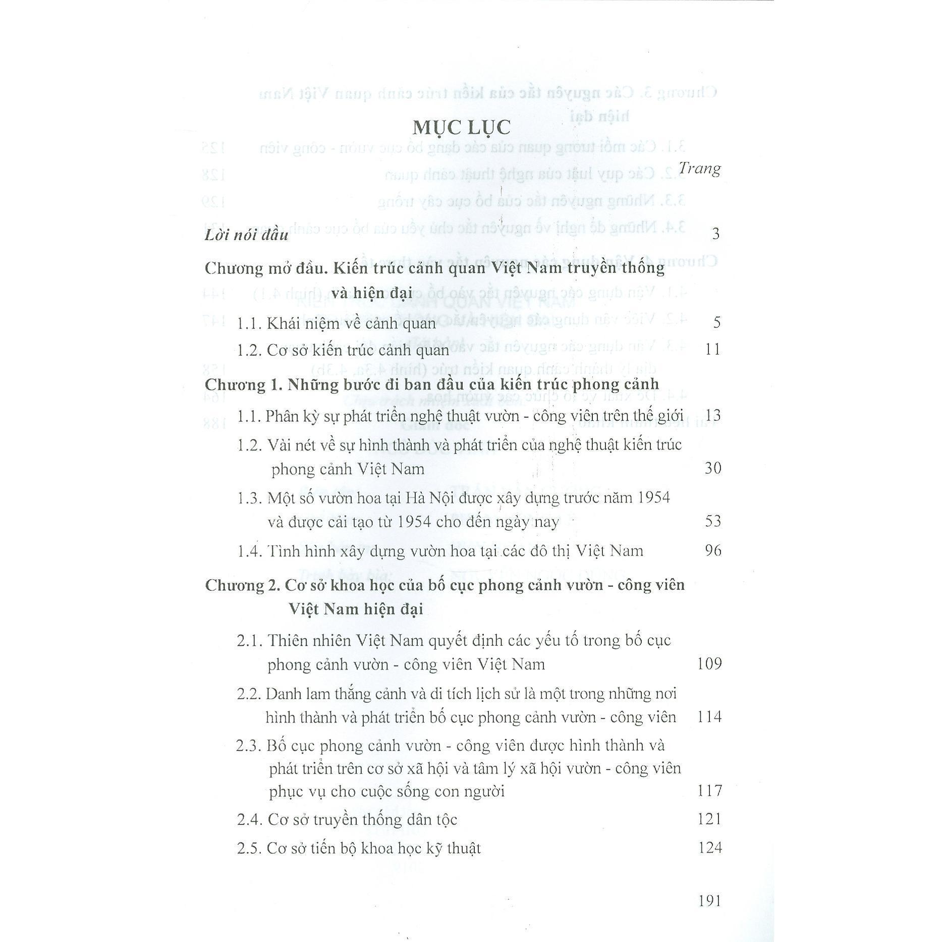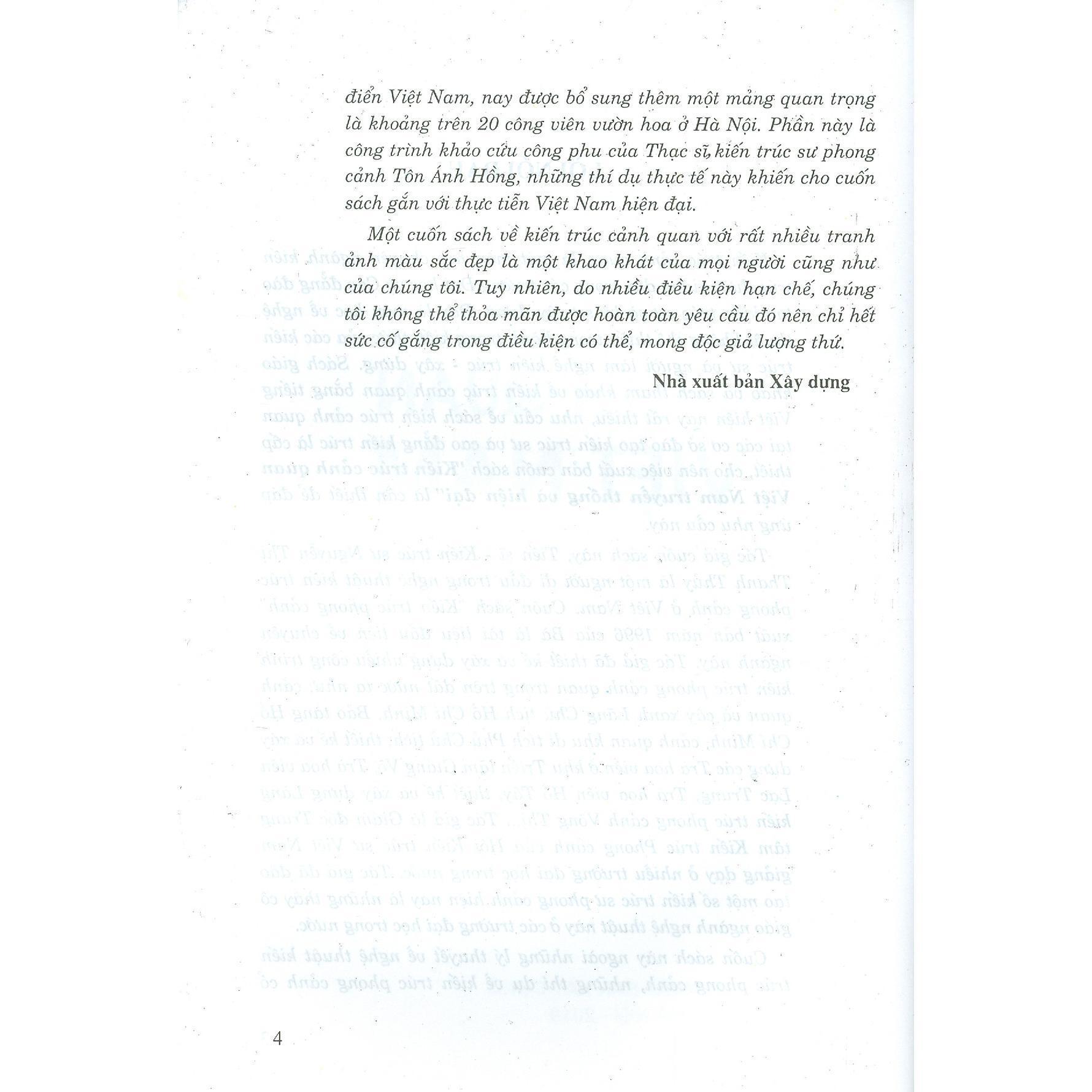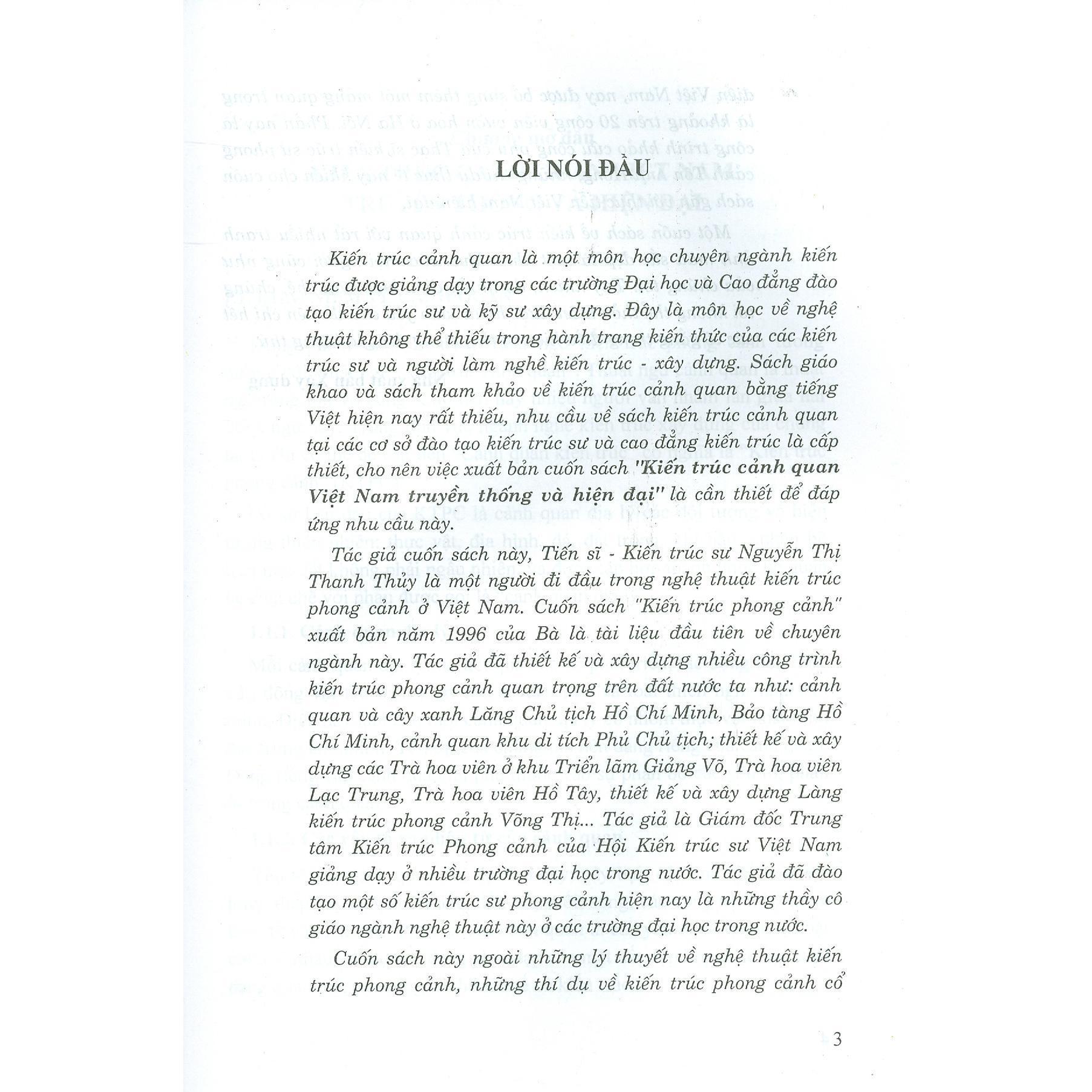 Kiến trúc cảnh quan là một môn học chuyên ngành kiến trúc được giảng dạy trong các trường Đại học và Cao đẳng đào tạo kiến trúc sư và kỹ sư xây dựng. Đây là môn học về nghệ thuật không thể thiếu trong hành trang kiến thức của các kiến trúc sư và người làm nghề kiến trúc - xây dựng. Sách giáo khao và sách tham khảo về kiến trúc cảnh quan bằng tiếng Việt hiện nay rất thiếu, nhu cầu về sách kiến trúc cảnh quan tại các cơ sở đào tạo kiến trúc sư và cao đẳng kiến trúc là cấp thiết, cho nên việc xuất bản cuốn sách"Kiến trúc cảnh quan Việt Nam truyền thống và hiện đại"là cần thiết để đáp ứng nhu cầu này.