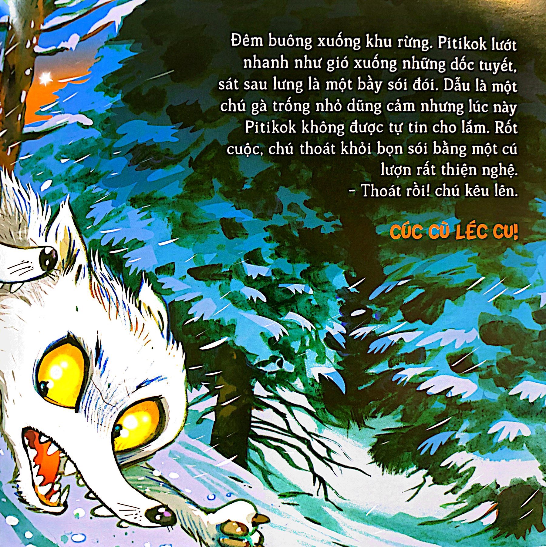 “Cúc cù léc cu!” Pitikok, chú gà giò đỏ lắm mưu mẹo, đã cứu được đúng tám quả trứng to bự bị một cơn lốc cuốn bay xuống dòng sông.