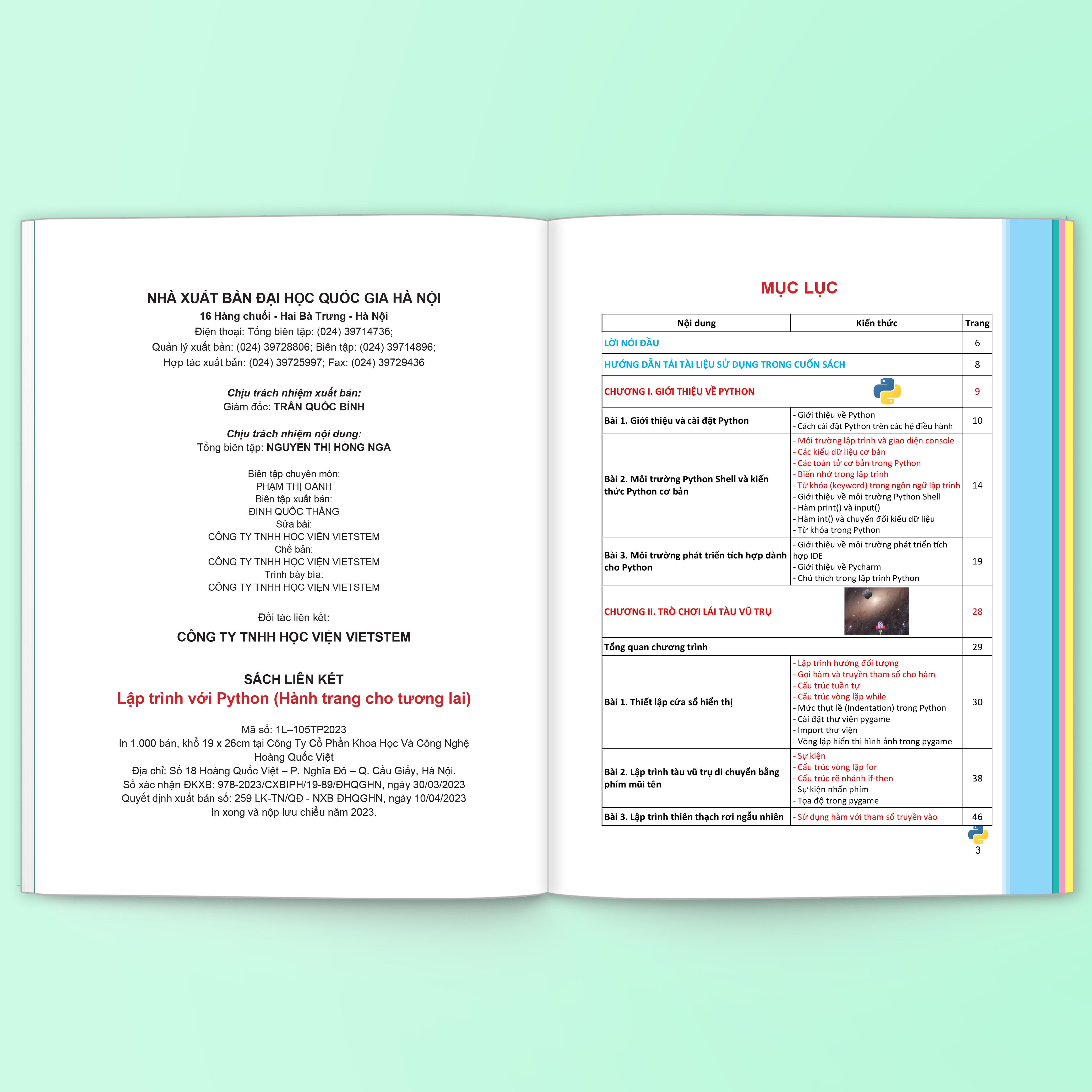 Gồm 15 bài học và 2 dự án thực hành. + Bài 1: Cài đặt môi trường phát triển + Bài 2: Ngôn ngữ lập trình Python + Bài 3: Biến và kiểu dự liệu