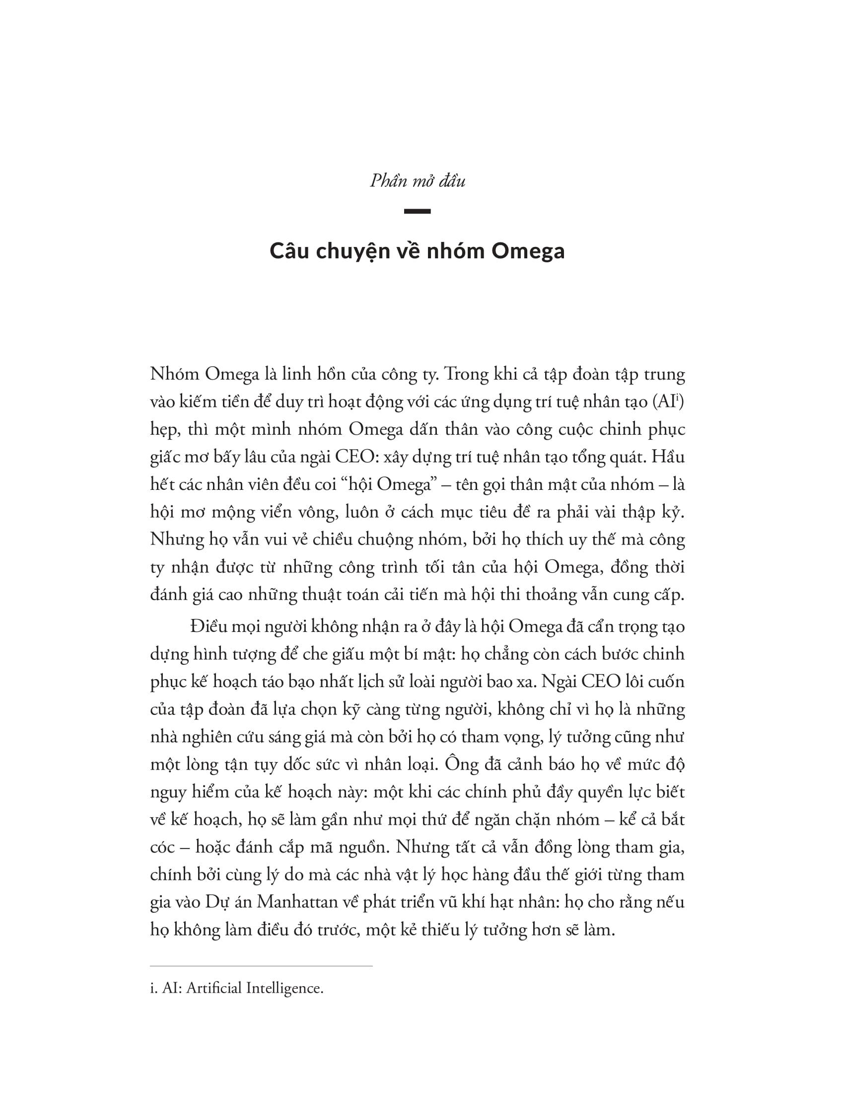 “Đó là câu chuyện của nhóm Omega. Phần còn lại của cuốn sách này nói về một câu chuyện khác hãy còn chưa được viết: tương lai của chính chúng ta với AI. Bạn muốn nó diễn ra như thế nào? Liệu điều xa lạ như câu chuyện của nhóm Omega có khả năng xảy ra không, và nếu có thì bạn muốn nó xảy ra chứ? Bỏ qua những phán đoán về AI siêu phàm, bạn muốn câu chuyện của chúng ta bắt đầu như thế nào? Bạn muốn AI tác động đến công việc, luật pháp và v.ũ khí trong thập kỷ tới theo cách nào? Nhìn xa hơn về phía trước, bạn sẽ viết nên kết cục như thế nào? Đây sẽ là một câu chuyện thực sự vĩ đại, bởi nó không chứa đựng điều gì ngoài chính vận mệnh tương lai của sự sống trong vũ trụ chúng ta. Và đó là câu chuyện chúng ta phải viết.”