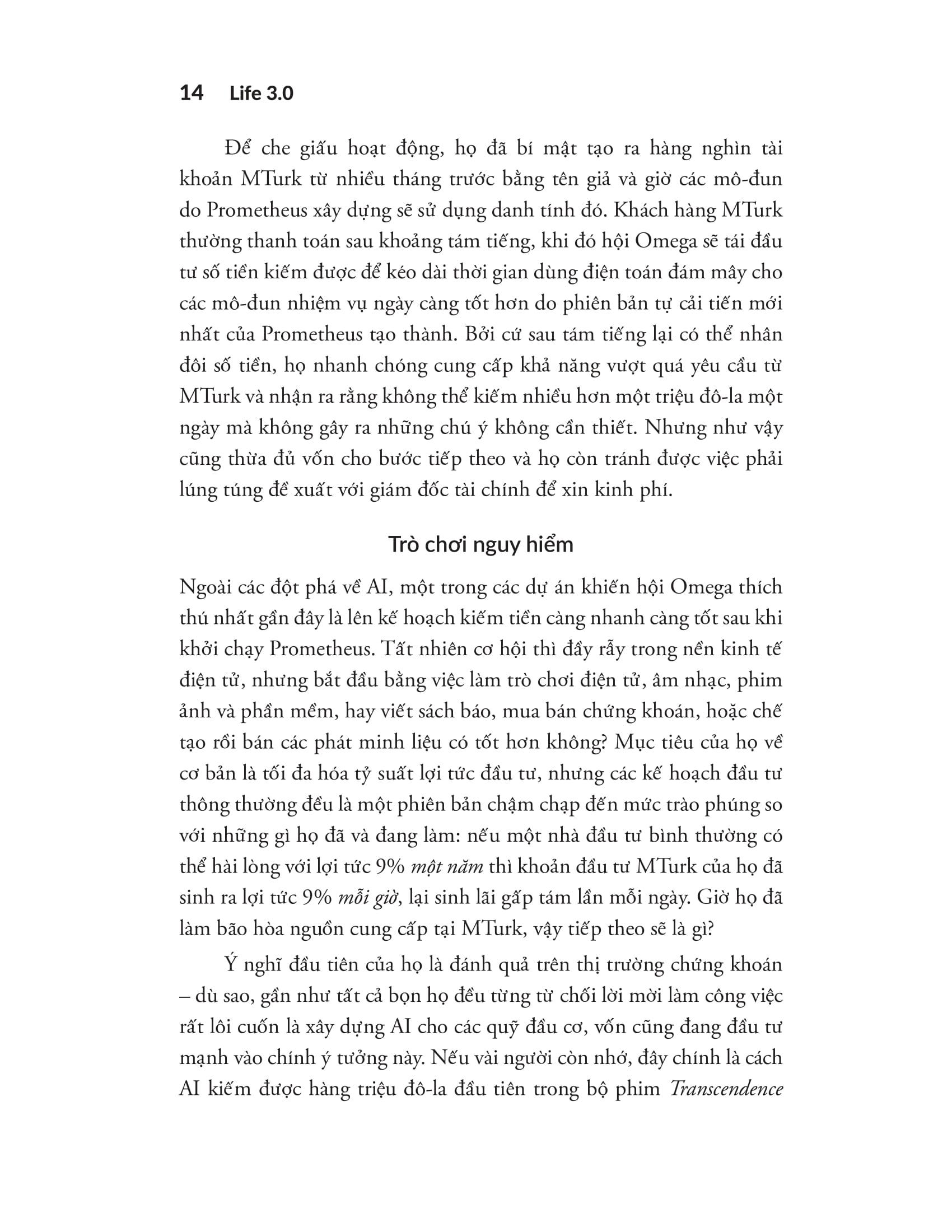 Life 3.0 – Loài người trong kỷ nguyên trí tuệ nhân tạo mở đầu bằng một câu chuyện giả tưởng đầy kịch tính về nhóm Omega – những nhà khoa học bí mật phát triển một AI có tên Prometheus với khả năng tự học, tự cải tiến, và thay đổi toàn bộ cục diện kinh tế - chính trị thế giới. Từ đó, Max Tegmark dẫn dắt người đọc đến những câu hỏi sống còn của nhân loại: Liệu chúng ta có làm chủ được trí tuệ nhân tạo hay bị chúng kiểm soát ngược lại?