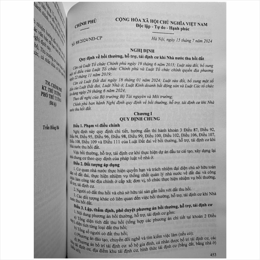 – Nghị định số 88/2024/NĐ-CP ngày 15 tháng 7 năm 2024 của Chính phủ Quy định về bồi thường, hỗ trợ, tái định cư khi Nhà nước thu hồi đất;
