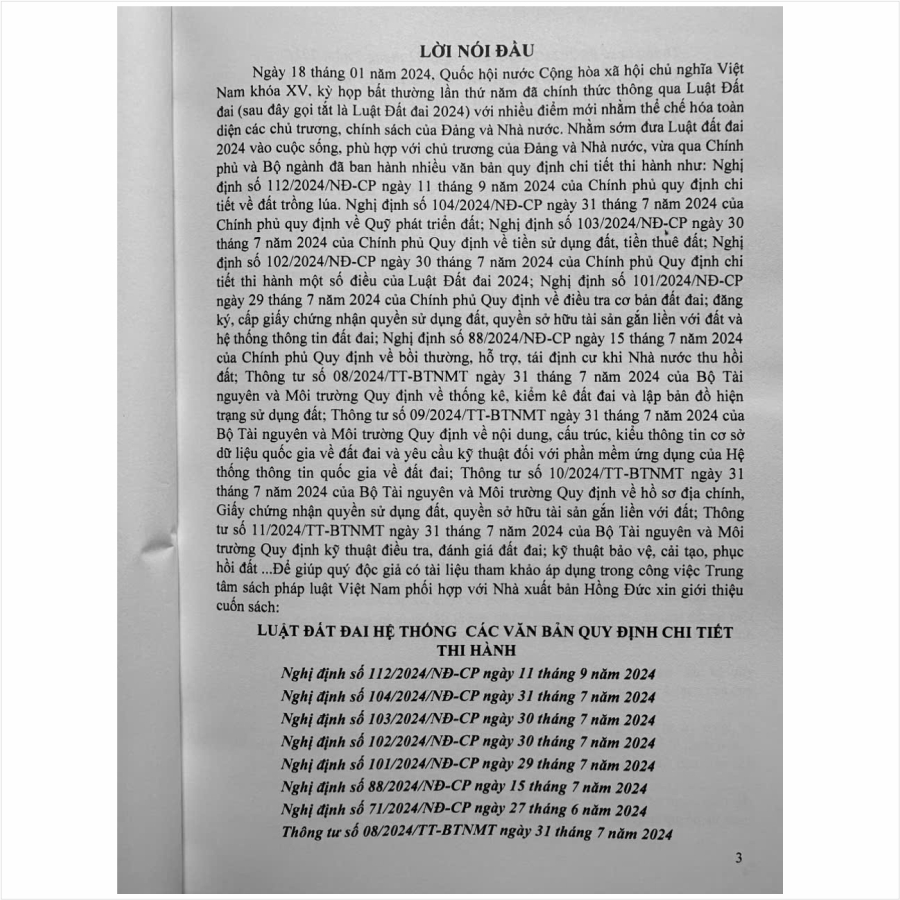 Ngày 18 tháng 01 năm 2024, Quốc hội nước Cộng hòa xã hội chủ nghĩa Việt Nam khóa XV, kỳ họp bất thường lần thứ năm đã chính thức thông qua Luật Đất đai số 31/2024/QH15 (sau đây gọi tắt là Luật Đất đai 2024) với nhiều điểm mới nhằm thể chế hóa toàn diện các chủ trương, chính sách của Đảng và Nhà nước. Nhằm sớm đưa Luật đất đai 2024 Chính phủ và các Bộ ngành đã ban hành nhiều văn bản quy định chi tiết thi hành như.