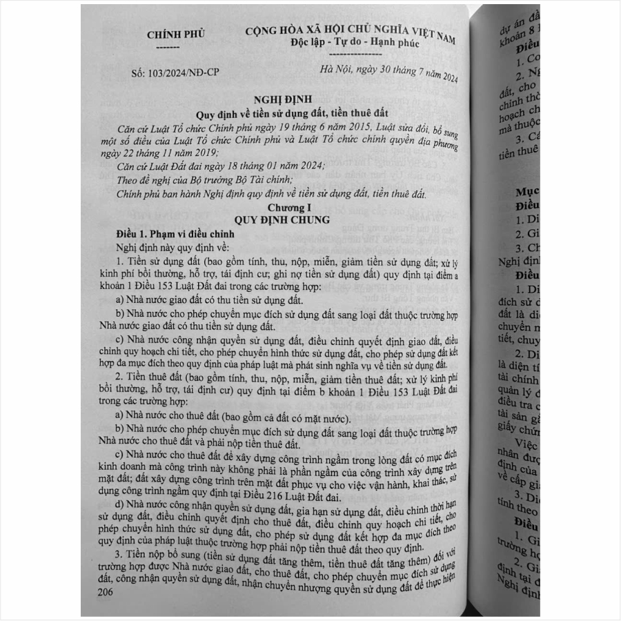 – Nghị định số 103/2024/NĐ-CP ngày 30 tháng 7 năm 2024 của Chính phủ Quy định về tiền sử dụng đất, tiền thuê đất;
