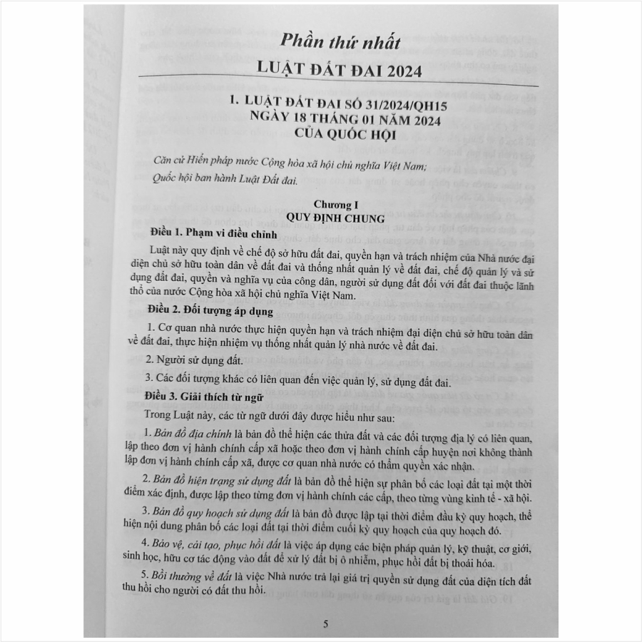 Luật Đất đai số 31/2024/QH15 được Quốc hội nước Cộng hòa xã hội chủ nghĩa Việt Nam khóa XV, kỳ họp bất thường lần thứ năm thông qua ngày 18 tháng 01 năm 2024,
