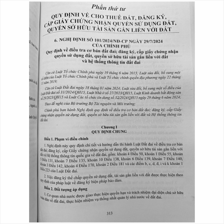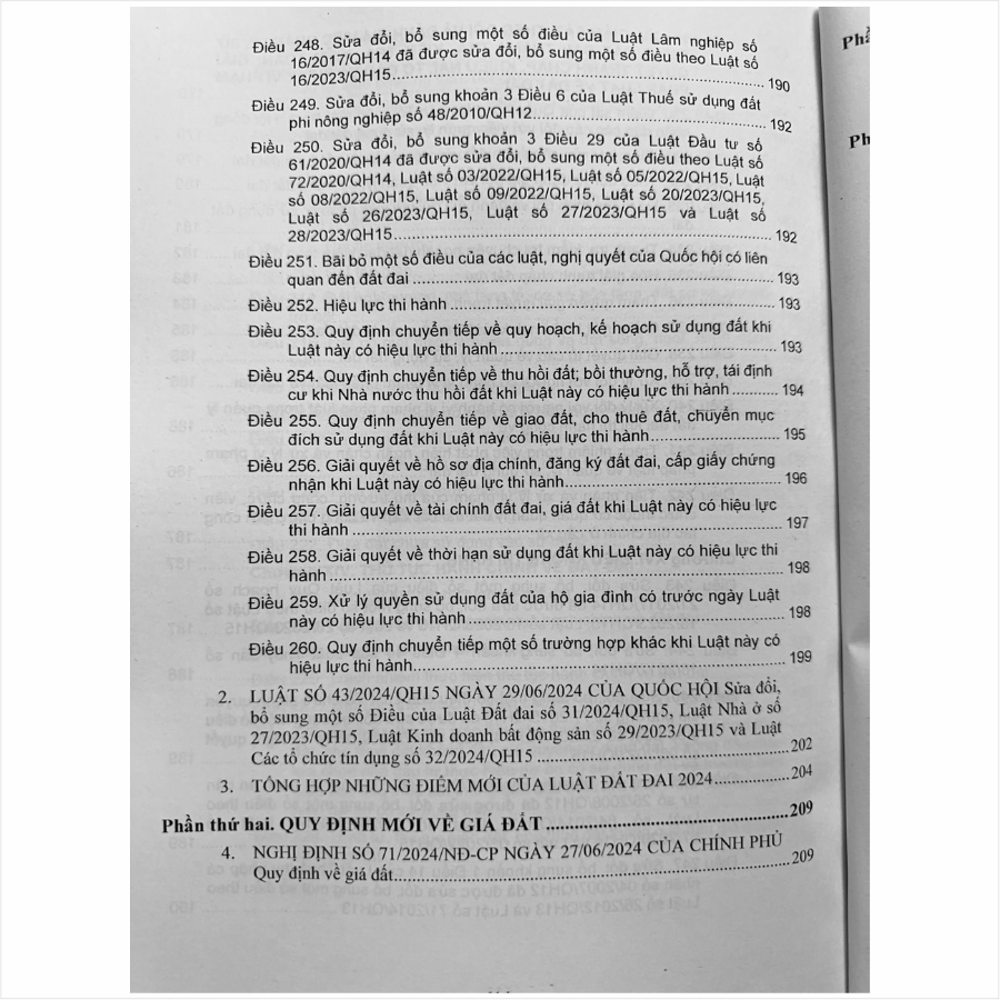 - Toàn bộ sách bìa mềm khổ lớn 20 x 28 cm phân phối bởi Nhà sách Nam Việt đều được bọc sách Plastic MIỄN PHÍ và xuất hóa đơn điện tử đầy đủ, nhanh chóng. …//… Lời giới thiệu: Luật Đất đai số 31/2024/QH15 đã được Quốc hội khóa XV thông qua ngày 18/01/2024. Luật Đất đai số 31/2024/QH15 gồm 16 chương, 260 điều, trong đó sửa đổi, bổ sung 180/212 điều của Luật Đất đai năm 2013 và bổ sung mới 78 điều. Để sớm đưa Luật Đất đai vào cuộc sống, phù hợp với chủ trương của Đảng, khắc phục những tồn tại, hạn chế, nhất là trong công tác định giá đất, thu hồi đất, bồi thường, hỗ trợ tái định cư, ngày 29/6/2024 Quốc hội đã thông qua Luật sửa đổi, bổ sung một số điều của Luật Đất đai số 31/2024/QH15, Luật Nhà ở số 27/2023/QH15, Luật Kinh doanh bất động sản số 29/2023/QH15, Luật Các tổ chức tín dụng số 32/2024/QH15. Ngoài ra trong sách đã cập nhật các Nghị định mới trong năm 2024 như sau: – Nghị định số 71/2024/NĐ-CP ngày 27/6/2024 Quy định về giá đất – Nghị định số 88/2024/NĐ-CP ngày 15/7/2024 Quy định về bồi thường, hỗ trợ, tái định cư khi nahf nước thu hồi đất – Nghị định 101/2024/NĐ-CP ngày 29/7/2024 Quy định về điều tra cơ bản đất đai; đăng ký, cấp giấy chứng nhận quyền sử dụng đất, quyền sở hữu tài sản gắn liền với đất và hệ thống thông tin đất đai – Nghị định 102/2024/NĐ-CP ngày 30/7/2024 Quy định chi tiết thi hành một số điều của Luật Đất đai – Nghị định 103/2024/NĐ-CP ngày 30/7/2024 Quy định về tiền sử dụng đất, tiền thuê đất – Nghị định 104/2024/NĐ-CP ngày 31/7/2024 Quy định quỹ phát triển đất