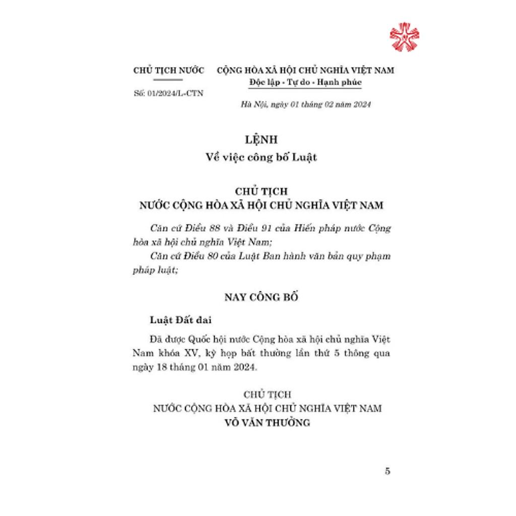 Luật Đất đai được Quốc hội khóa XV, kỳ họp bất thường lần thứ 5 thông qua ngày 18 tháng 01 năm 2024, có hiệu lực thi hành từ ngày 01 tháng 01 năm 2025, trừ trường hợp quy định tại khoản 2 và khoản 3 Điều này. Luật này quy định về chế độ sở hữu đất đai, quyền hạn và trách nhiệm của Nhà nước đại diện chủ sở hữu toàn dân về đất đai và thống nhất quản lý về đất đai, chế độ quản lý và sử dụng đất đai, quyền và nghĩa vụ của công dân, người sử dụng đất đối với đất đai thuộc lãnh thổ của nước Cộng hòa xã hội chủ nghĩa Việt Nam.