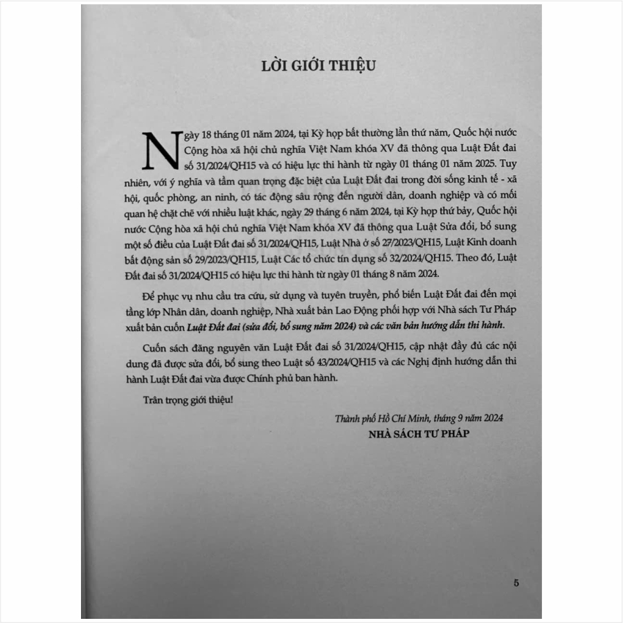 Luật Đất đai (sửa đổi, bổ sung năm 2024) và các văn bản hướng dẫn thi hành Tác giả: Quốc Hội Nhà xuất bản: Lao Động Công ty phát hành: Nhà sách Tư Pháp Ngày