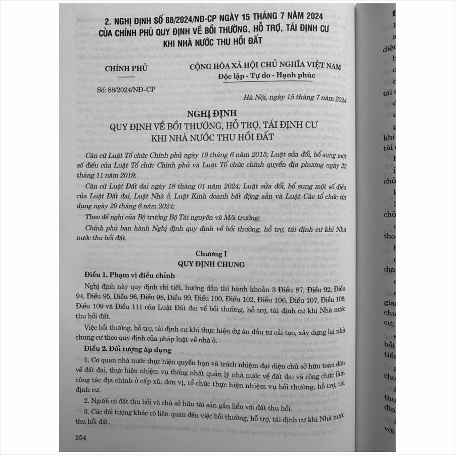 – Nghị định số 88/2024/NĐ-CP ngày 15 tháng 7 năm 2024 của Chính phủ Quy định về bồi thường, hỗ trợ, tái định cư khi Nhà nước thu hồi đất;