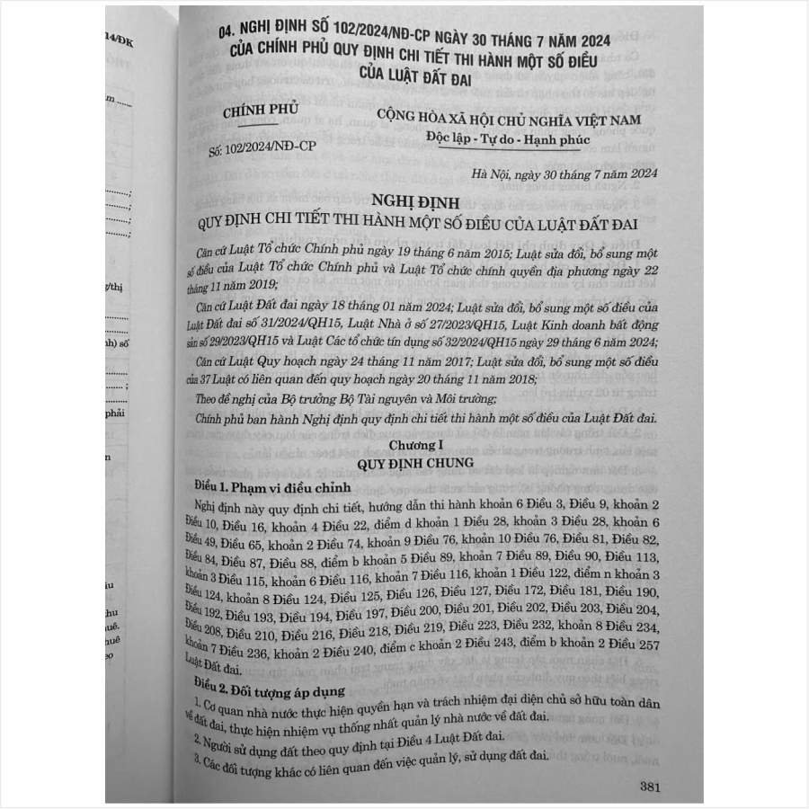 – Nghị định số 102/2024/NĐ-CP ngày 30 tháng 7 năm 2024 của Chính phủ Quy định chi tiết thi hành một số điều của Luật Đất đai 2024