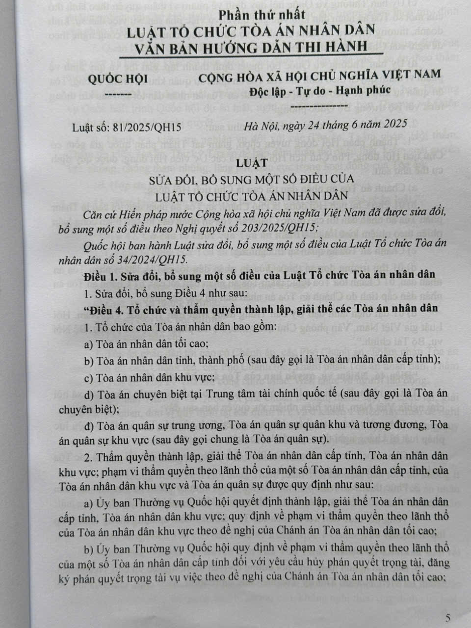 Ngày 24 tháng 6 năm 2025 tại kỳ họp thứ 9 Quốc hội nước Cộng hòa xã hội chủ nghĩa Việt Nam đã thông qua Luật số 81/2025/QH15 ngày 24 tháng 6 năm 2025 của Quốc hội sửa đổi, bổ sung một số điều của Luật Tổ chức Tòa án nhân dân số 34/2024/QH15; Luật số 82/2025/QH15 sửa đổi, bổ sung một số điều của Luật Tổ chức Viện kiểm sát nhân dân số 63/2014/QH13.
