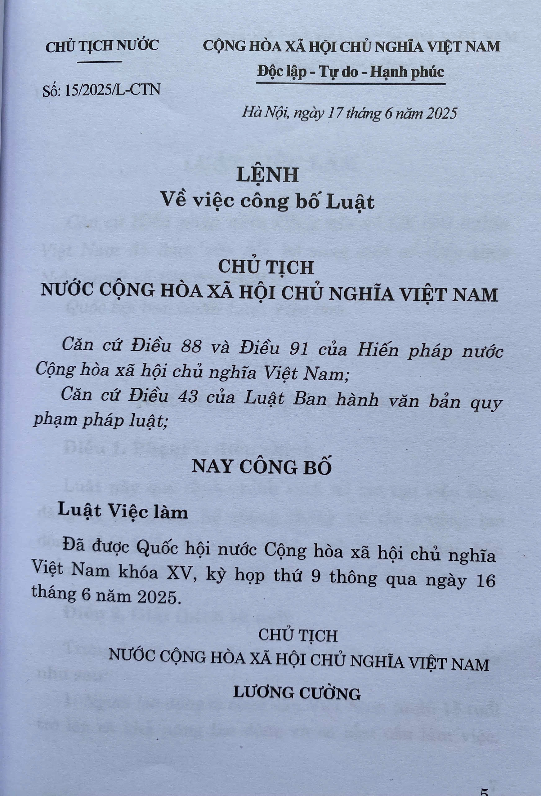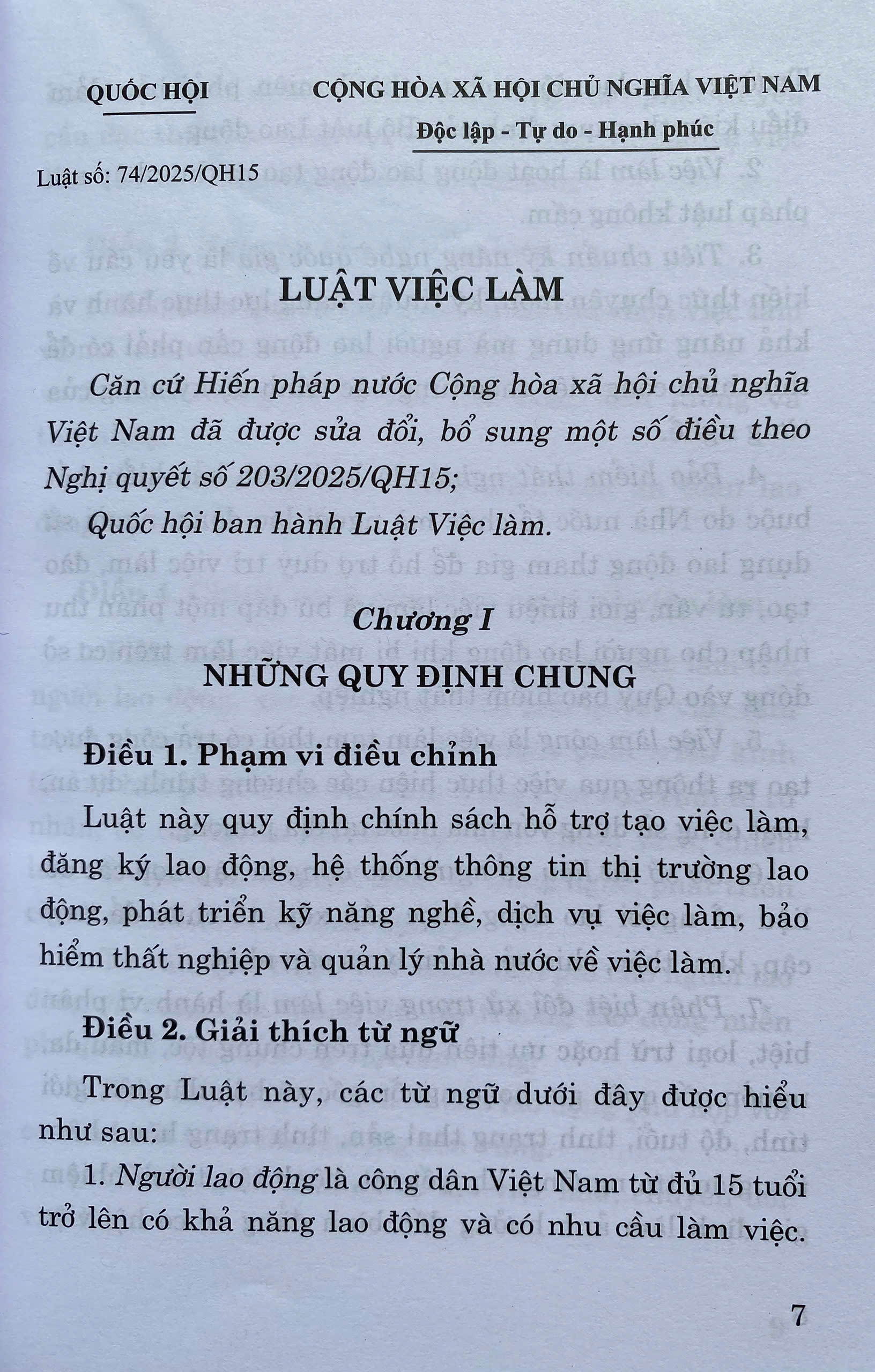 Luật Việc Làm số 74/2025/QH15 đã được Quốc Hội khoá XV, kỳ họp thứ 9 thông qua ngày 16-06-2025 . Luật gồm có 8 Chương, 55 Điều. Luật có hiệu lực áp dụng từ ngày 01-01-2026.