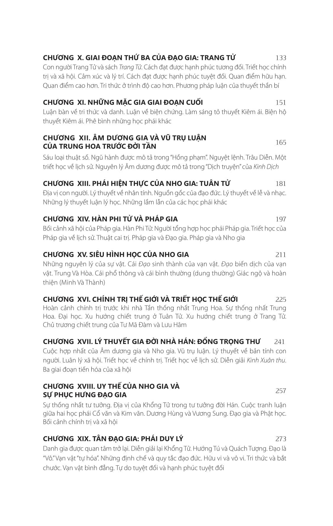 Cuốn sách làm sáng tỏ những trường phái triết học phổ biến nhất như Nho gia và Đạo gia; đồng thời giới thiệu với độc giả về Mặc gia, Âm Dương gia, Pháp gia, Tân Đạo gia, Tân Nho gia và sự du nhập của triết học Tây phương.