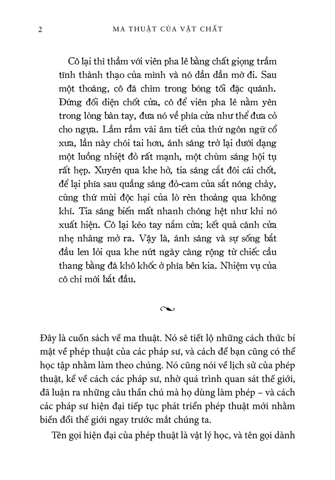 Vật lý vật chất ngưng tụ là những gì xảy ra khi các nguyên tử tụ lại với nhau để tạo ra thứ gì đó có kích thước mà chúng ta có thể hiểu được – như chiếc xe hơi, hay một thiên hà. Đó là thứ làm cho mọi vật lơ lửng trong không trung hoặc khiến các tinh thể phát sáng. Đó cũng là những gì mà chúng ta gọi là ma thuật. Với Ma thuật của vật chấtr, tác giả đưa bạn đọc vào một cuộc phiêu lưu thực nghiệm trong vật lý vật chất ngưng tụ, cơ chế khoa học đằng sau những bí ẩn của thuật giả kim, chuyển hóa và nhiều hơn thế nữa. Cuốn sách là bản hướng dẫn về cách khai thác các hoạt động bí ẩn của thế giới tự nhiên để trở thành một pháp sư thời hiện đại.