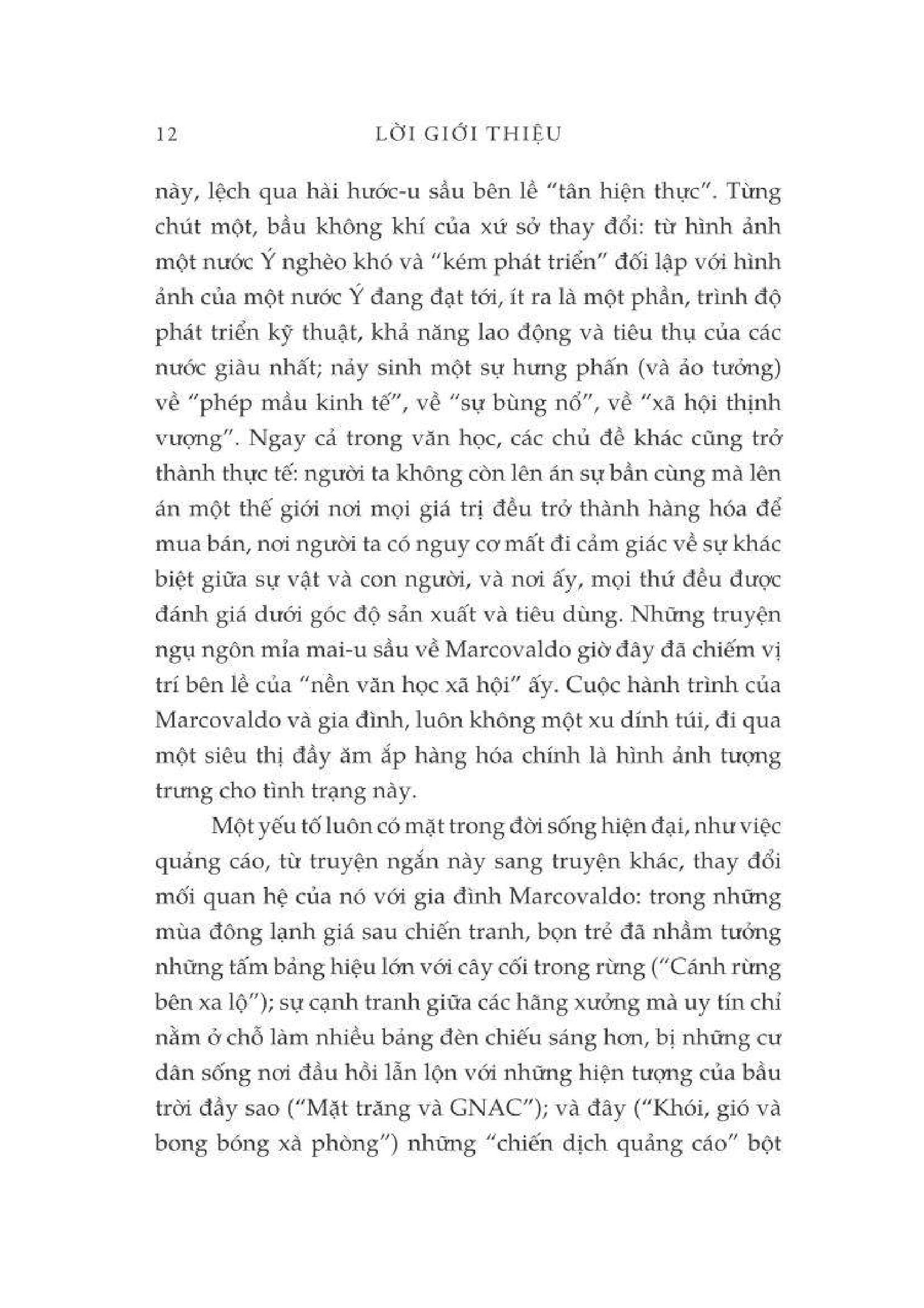Marcovaldo hay Các mùa trong thành phố gồm hai mươi truyện ngắn, mỗi truyện tái hiện một mùa trong năm với vòng xoay bốn mùa lặp lại năm lần. Tác phẩm xoay quanh nhân vật chính là Marcovaldo, một lao động phổ thông luôn hướng về thiên nhiên nhưng buộc phải sống giữa lòng thành phố, người luôn tìm ra niềm vui từ những dấu vết nhỏ bé, giản dị như một cái lá vàng úa trên cành hay nấm mọc ở vệ đường. Marcovaldo còn là cha của một gia đình nghèo khó, đông con với những bộn bề lo toan của cuộc sống. Cũng chính từ đây, hàng loạt tình huống khôi hài với cái kết bất ngờ liên tục diễn ra khiến bức tranh về cuộc sosongs đời thường của một gia đình lao động nghèo ở Ý hiện lên đầy sống động và thú vị.