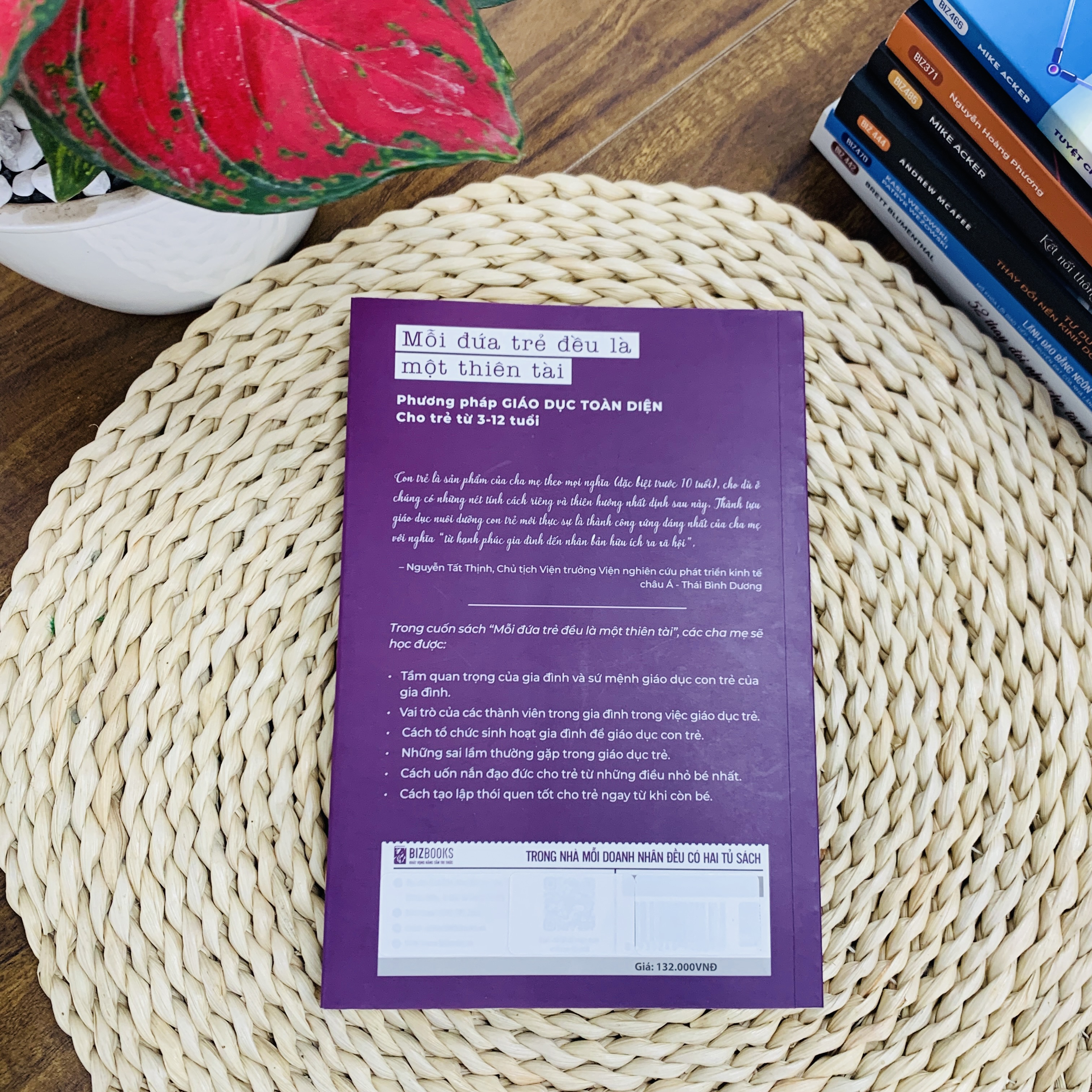 Tập hợp những phương pháp giáo dục con trẻ chuẩn mực, kế thừa sự tiến bộ của những phương pháp phổ biến như Reggio Emilia hay Montessori, Mỗi đứa trẻ đều là một thiên tài là cuốn sách hướng tới triết lý giáo dục con trẻ phù hợp với người Việt Nam. Nội dung sách được triển khai với ba phương diện tiếp cận: Tâm sinh lý lứa tuổi - Tạo dựng và rèn giũa phẩm chất - Giao thoa giá trị. Cha mẹ có thể cùng tìm hiểu về cách tạo lập thói quen tốt và cách giáo dục con cái một cách thông minh và đầy yêu thương thông qua 7 chương sách