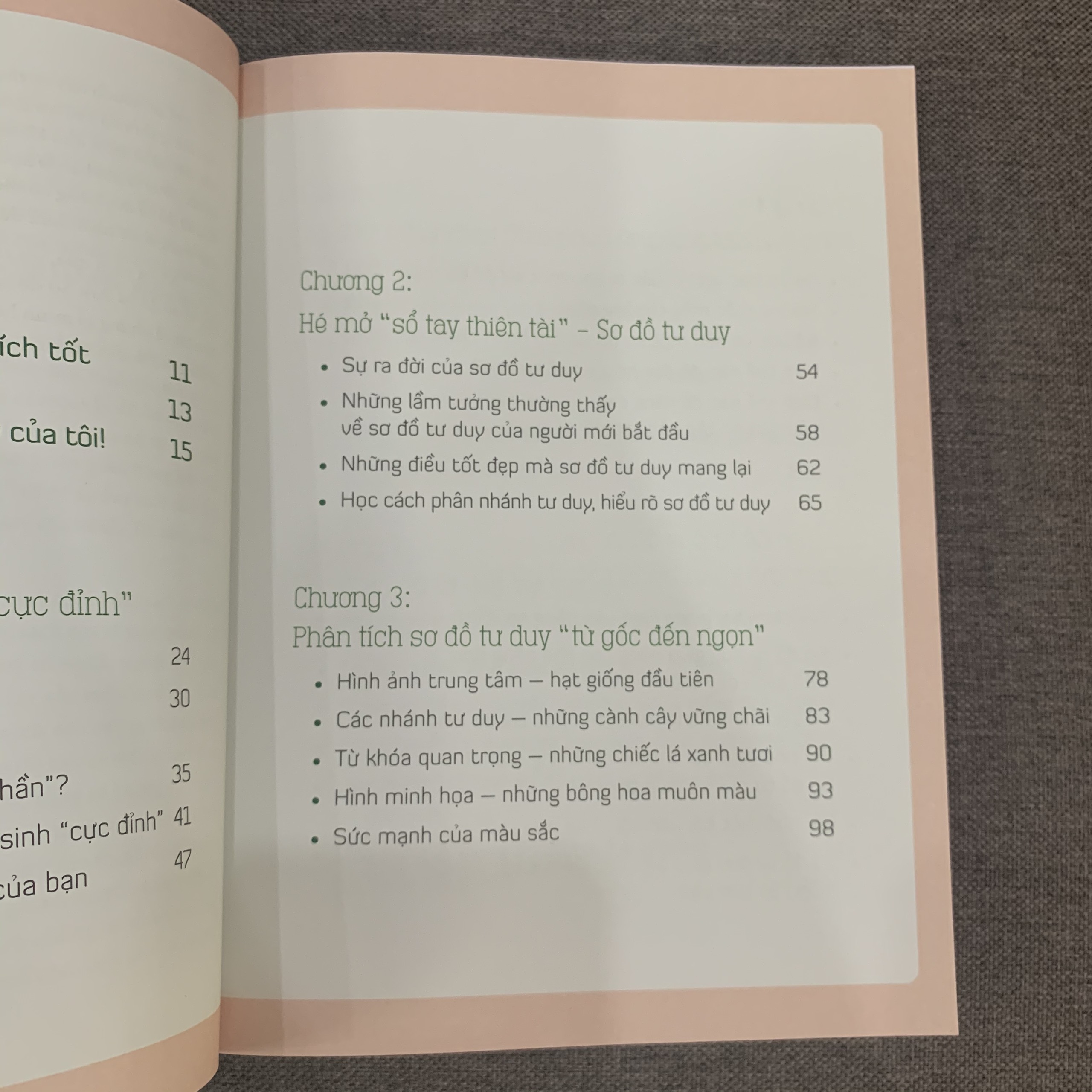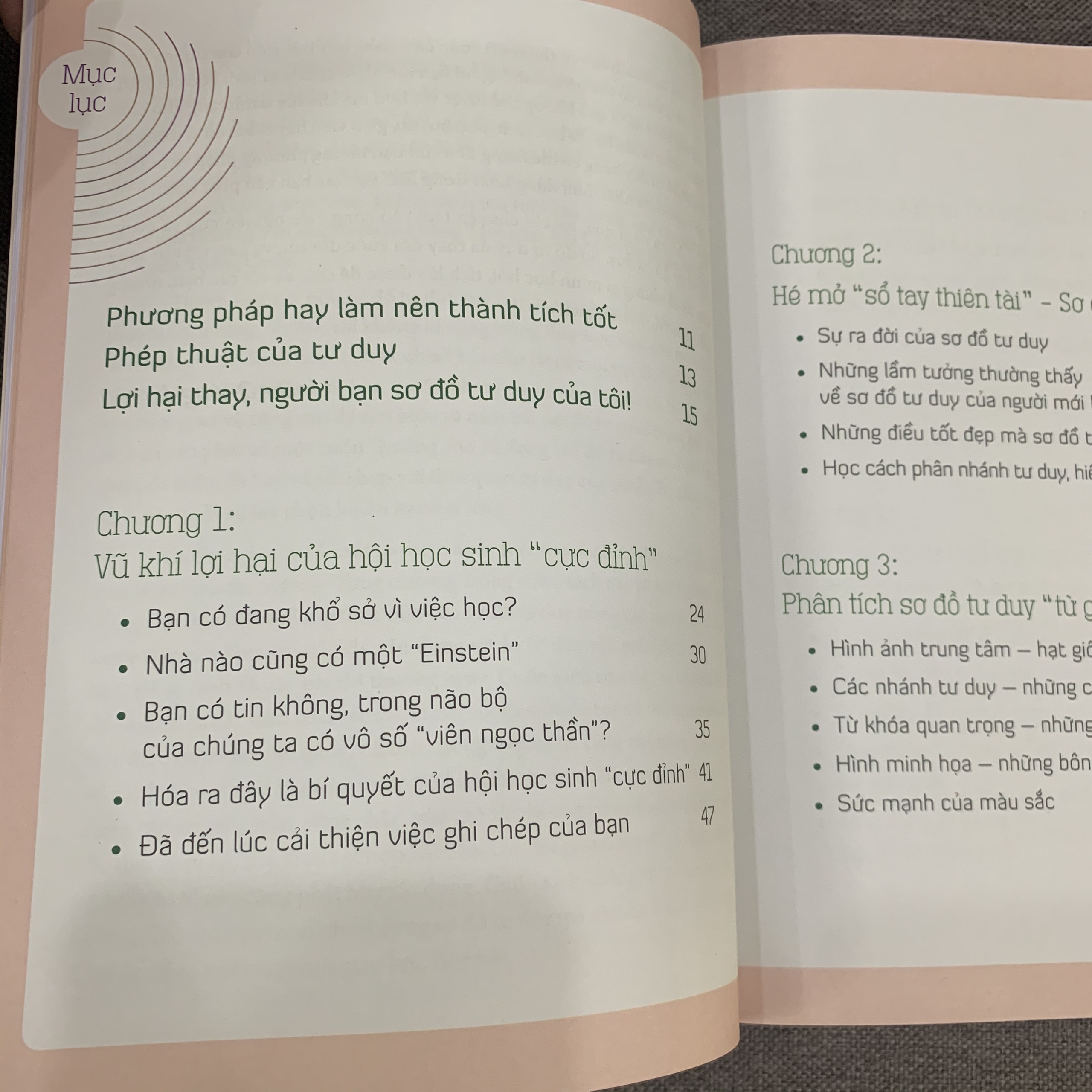 Cuốn sách này có một số điểm khác biệt so với nhiều đầu sách về sơ đồ tư duy khác. Từng chương trong cuốn sách đều xoay quanh nội dung chủ đạo là ứng dụng thực tiễn của sơ sơ đồ tư duy trong cuộc sống và học tập, từng bước dạy bạn làm thế nào để vận dụng sơ đồ tư duy đối với các môn học: ngữ văn, toán học, tiếng anh và các bài thi tường ngày.