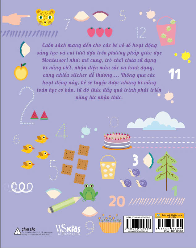 Mua tại TiktokCuốn sách mang đến cho các bé vô số hoạt động sáng tạo và vui tươi dựa trên phương pháp giáo dục Montessori như: mê cung, trò chơi chưa sử dụng kĩ năng viết, nhận diện màu sắc và hình dạng, cùng nhiều sticker dễ thương.... Thông qua các hoạt động này, bé sẽ luyện được những kĩ năng toán học cơ bản, từ đó thúc đẩy quá trình phát triển năng lực nhận thức.
