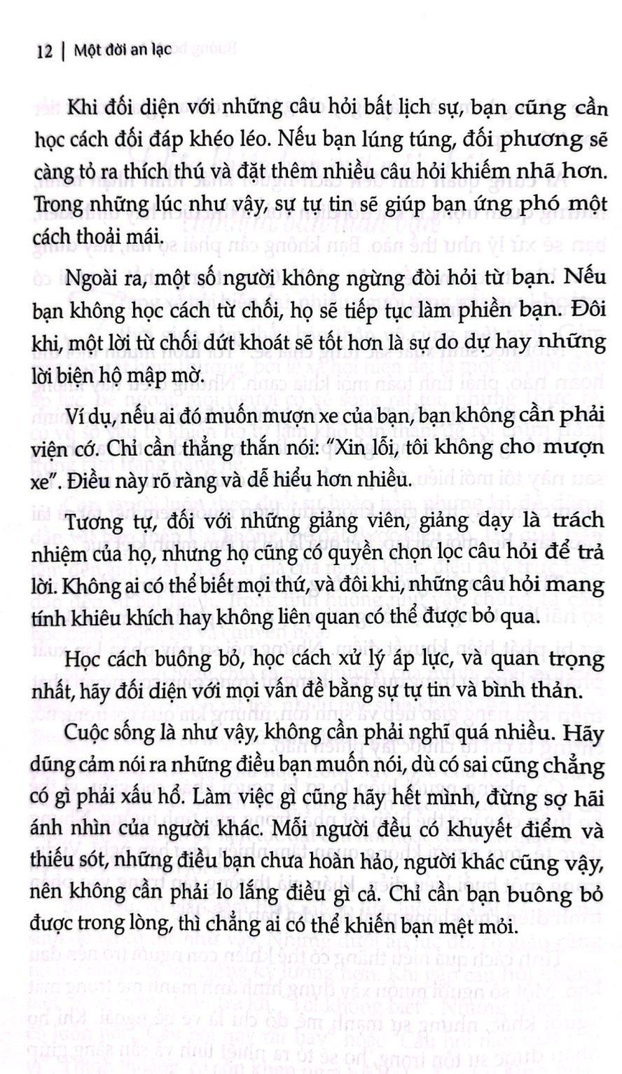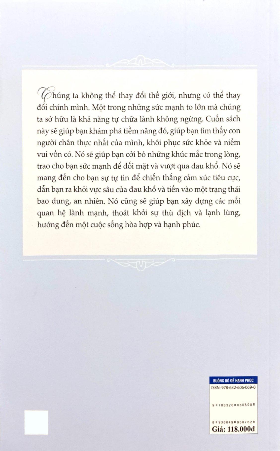 Một Đời An Lạc - Buông Bỏ Để Hạnh Phúc Chúng ta không thể thay đổi thế giới, nhưng có thể thay đổi chính m.ình. Một trong những sức mạnh to lớn mà chúng ta sở hữu là khả năng tự chữa lành không ngừng. Cuốn sách này sẽ giúp bạn khám phá tiềm năng đó, giúp bạn tìm thấy con người chân thực nhất của m.ình, khôi phục sức khỏe và niềm vui vốn có. Nó sẽ giúp bạn cởi bỏ những khúc mắc trong lòng, trao cho bạn sức mạnh để đối mặt và vượt qua đau khổ. Nó sẽ mang đến cho bạn sự tự tin để chiến thắng cảm xúc tiêu cực, dẫn bạn ra khỏi vực sâu của đau khổ và tiến vào một trạng thái bao dung, an nhiên. Nó cũng sẽ giúp bạn xây dựng các mối quan hệ lành mạnh, thoát khỏi sự thù địch và lạnh lùng, hướng đến một cuộc sống hòa hợp và hạnh phúc.