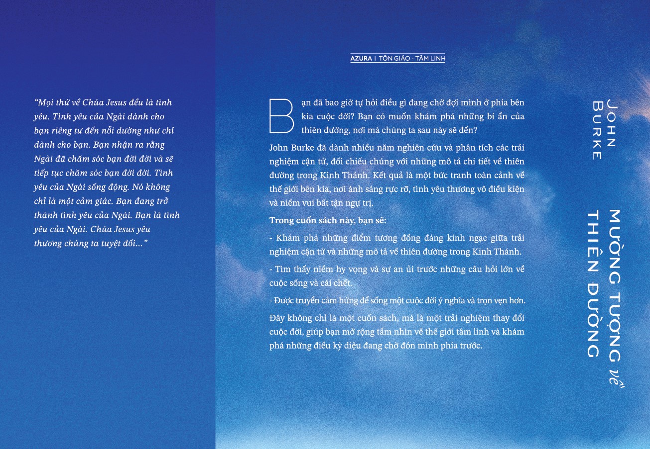 Mua tại TiktokNhà phát hành: Nhã Nam Nhà xuất bản: Thế Giới Tác giả: John Burke Dịch giả: Keo Số trang: 424 Kích thước: 15.5 x 24 cm Bạn đã bao giờ tự hỏi điều gì đang chờ đợi mình ở phía bên kia cuộc đời? Bạn có muốn khám phá những bí ẩn của thiên đường, nơi mà chúng ta sau này sẽ đến? John Burke đã dành nhiều năm nghiên cứu và phân tích các trải nghiệm cận tử, đối chiếu chúng với những mô tả chi tiết về thiên đường trong Kinh Thánh. Kết quả là một bức tranh toàn cảnh về thế giới bên kia, nơi ánh sáng rực rỡ, tình yêu thương vô điều kiện và niềm vui bất tận ngự trị. Trong cuốn sách này, bạn sẽ: Khám phá những điểm tương đồng đáng kinh ngạc giữa trải nghiệm cận tử và những mô tả về thiên đường trong Kinh Thánh.