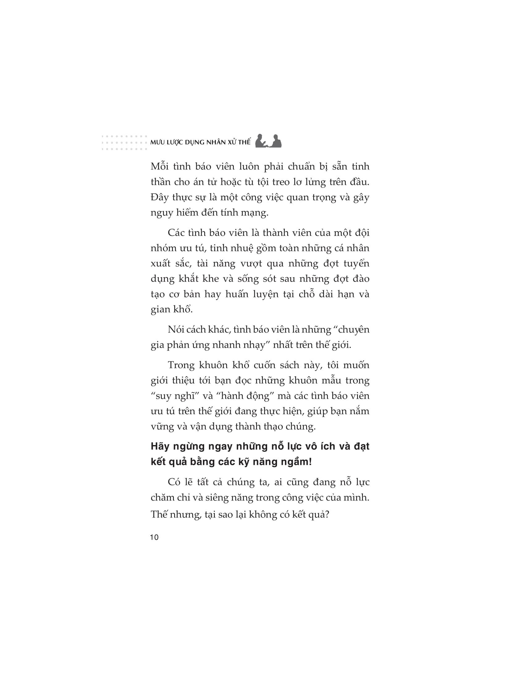 Các điệp viên tình báo, hay còn gọi là tình báo viên, được coi là lực lượng tinh nhuệ hàng đầu. Họ được đào tạo, huấn luyện và rèn giũa để có thể hoàn thành những nhiệm vụ gian khổ, khó nhằn nhất một cách bình tĩnh và nhanh chóng, dù trong bất kỳ điều kiện, hoàn cảnh nào. Họ đã làm điều đó bằng cách nào? Những kỹ thuật của họ tài tình ra sao? Chúng có liên quan gì đến công việc kinh doanh ngoài thực tế? Câu trả lời đều có trong cuốn sách này.