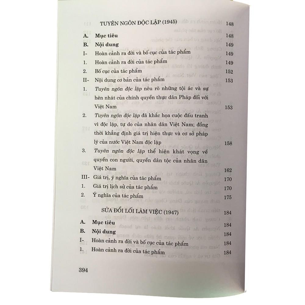Nội dung cuốn sách gồm hai phần: Phần thứ nhất nêu một số vấn đề lý luận chung về dạy học tác phẩm Hồ Chí Minh; Phần thứ hai giới thiệu một số tác phẩm tiêu biểu của Hồ Chí Minh (như: Bản án chế độ thực dân Pháp, Đường kách mệnh, Cương lĩnh chính trị đầu tiên, Tuyên ngôn độc lập...). Trong mỗi tác phẩm, các tác giả xác định mục tiêu dạy học tác phẩm (năng lực, phẩm chất), hoàn cảnh ra đời và bố cục của tác phẩm, nội dung cơ bản của tác phẩm, giá trị của tác phẩm và một số câu hỏi ôn tập, củng cố...