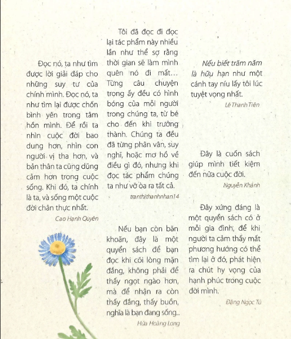 Với giọng văn dung dị, thân mật, tác giả dễ dàng chạm đến trái tim người đọc, khiến ta như đang lắng nghe một người bạn tâm sự. Những câu chuyện giản dị nhưng chứa nhiều tầng cảm xúc: hoài niệm, sâu sắc, chân thành - gợi mở những suy ngẫm mới mẻ về giá trị của từng khoảnh khắc trong cuộc đời.