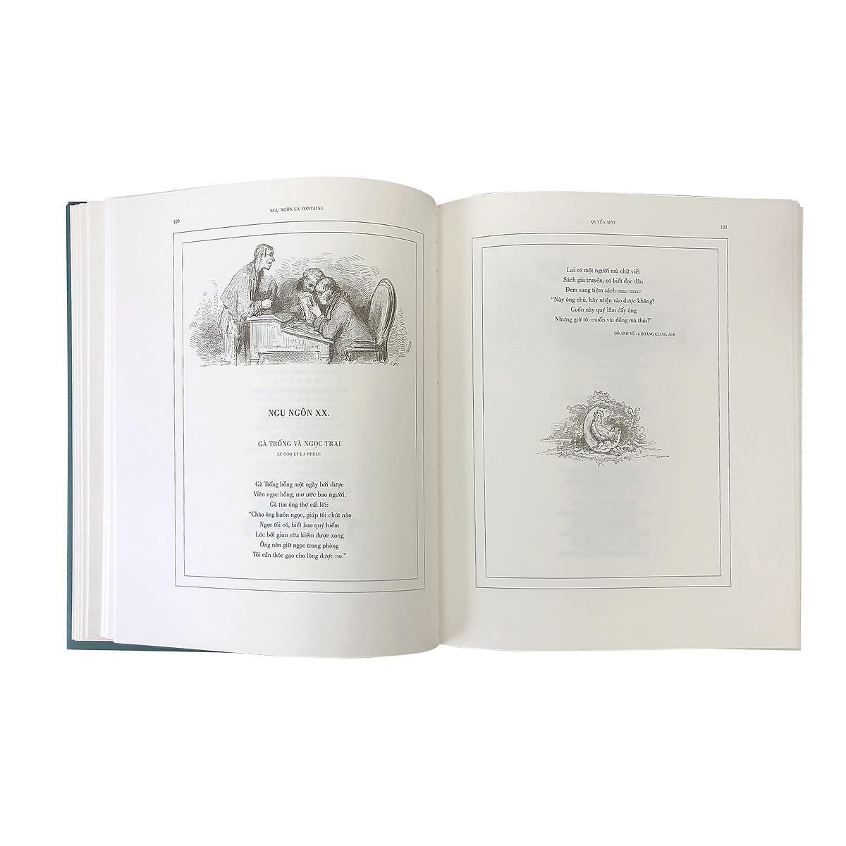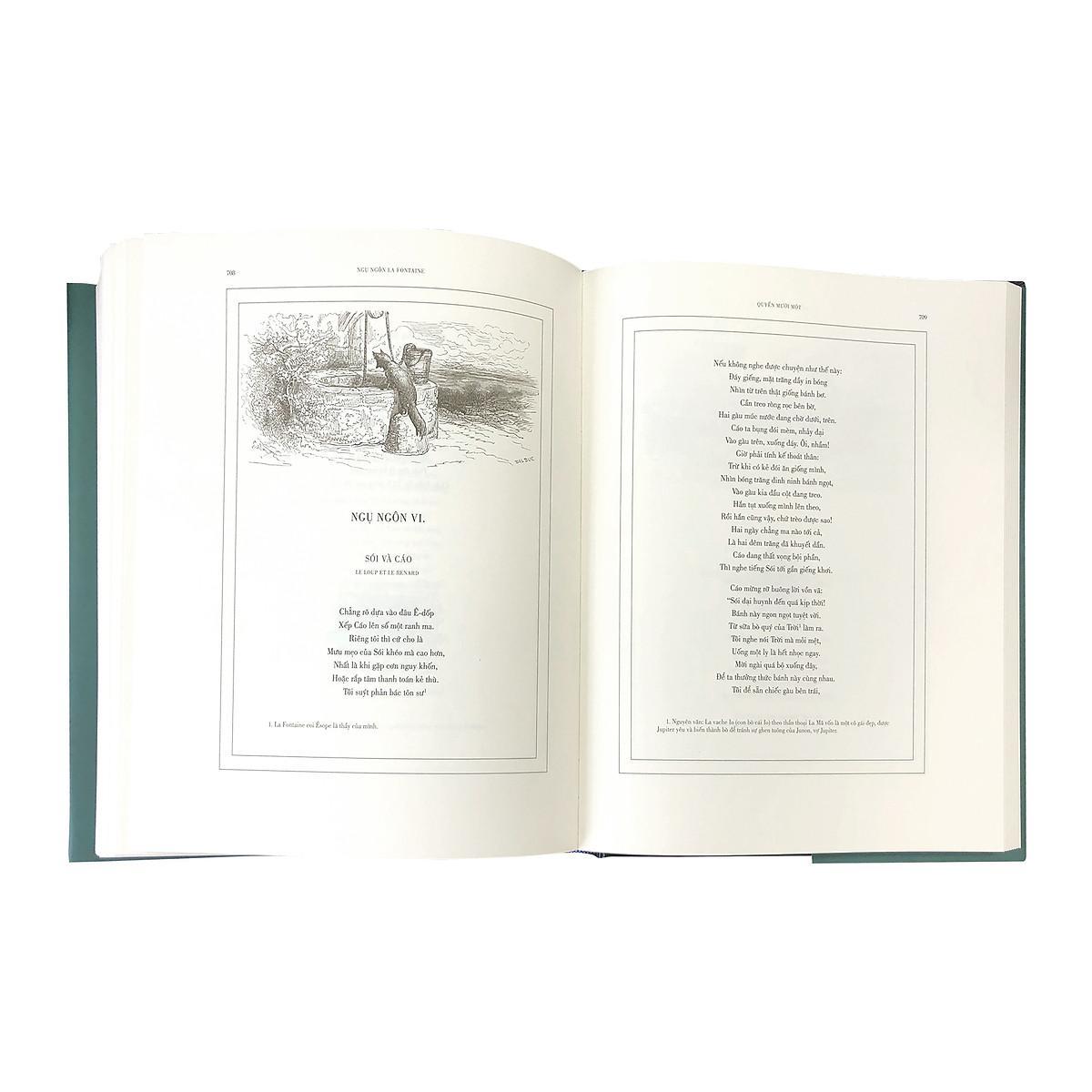 Ngụ ngôn La Fontaine – Toàn tập ngụ ngôn với bản dịch của các thế hệ dịch giả Việt NamTác giả: La FontaineNhiều dịch giảMinh hoạ: Gustave DoréKích thước: 25 x 30 cmSố trang: 828 trangHình thức: Bìa cứng, in hai màu. Khối lượng: 3.900 grSách do Công ty Cổ phần Văn hóa Đông A và NXB Văn học liên kết ấn hànhPhát hành: 01/2022