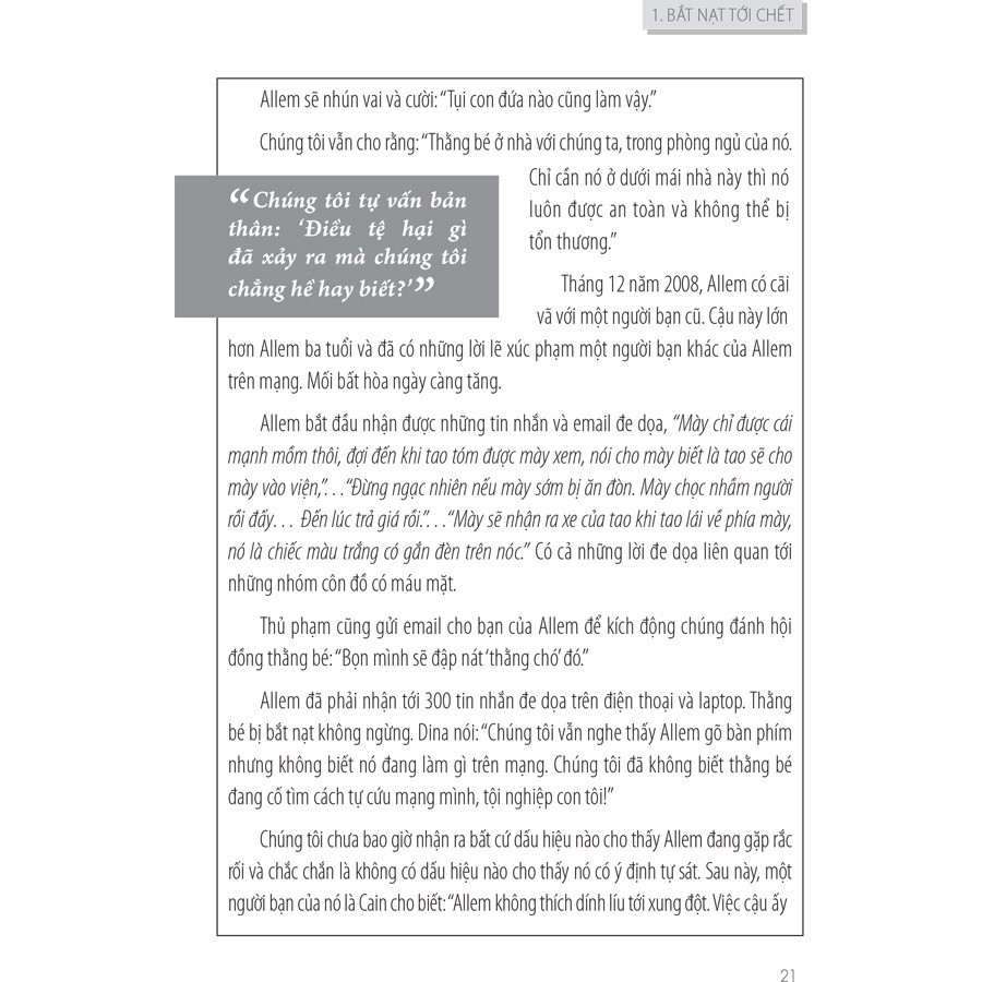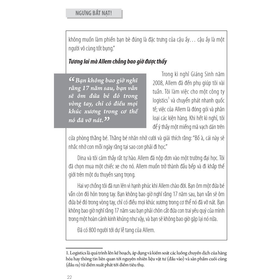 Bắt nạt là vấn đề xã hội đã tồn tại trong một khoảng thời gian dài và gây tác động tiêu cực đến tâm lý, cảm xúc và sức khỏe của rất nhiều người. Vậy nhưng, chỉ khi bắt nạt dần tiến triển thành những vấn đề nghiêm trọng hơn như bạo lực học đường, bạo lực giới, bạo lực gia đình thì chúng ta mới thực sự dành nhiều sự quan tâm đến vấn đề đó. Cuốn sách “Ngưng bắt nạt” chính là hồi chuông cảnh tỉnh mọi người về thực trạng đáng buồn này, đồng thời cuốn sách cũng sẽ chia sẻ đến bạn đọc những phương pháp để đẩy “bắt nạt” bước ra khỏi cuộc sống của chúng ta.